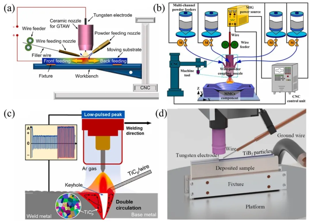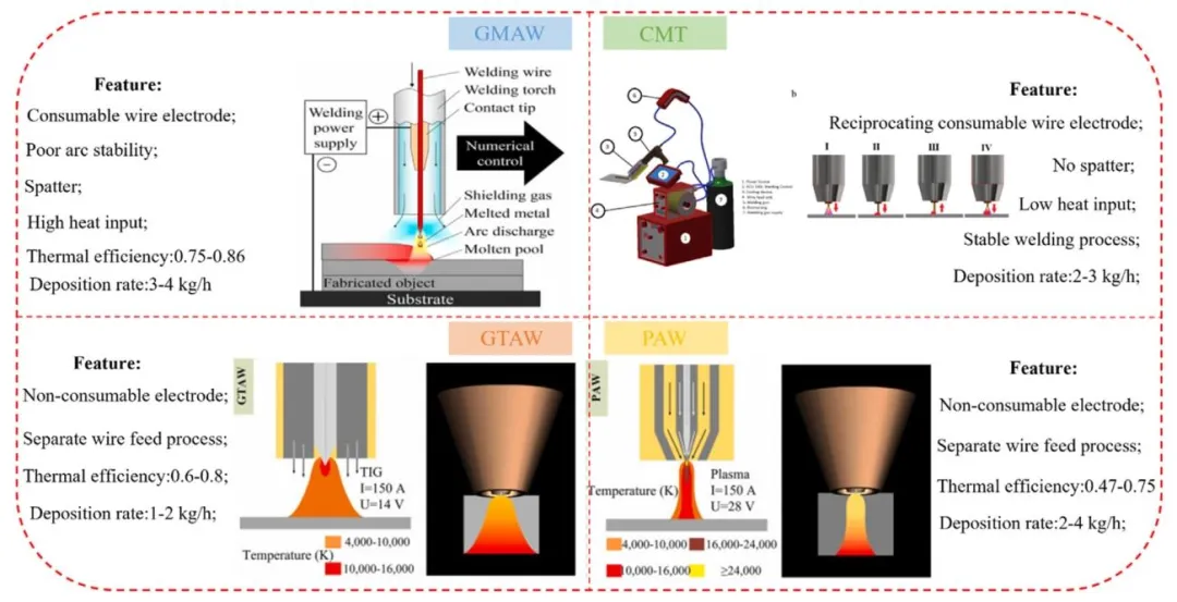 - 丝弧定向能量沉积(WA-DED)具有高效率、低成本、可制造大型构件的优势,无镁粉使用安全风险,适用于大型复杂镁合金构件批量生产,但面临成型精度控制、微观结构调控及性能稳定性等挑战。其工艺类型包括气体金属电弧焊(GMAW)、气体钨极电弧焊(GTAW)、等离子弧焊(PAW)及冷金属过渡(CMT)技术。