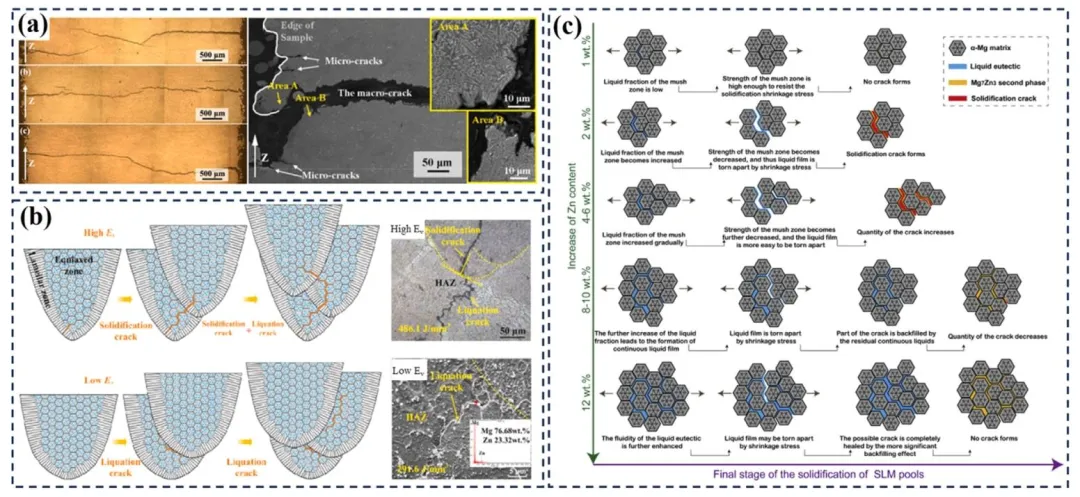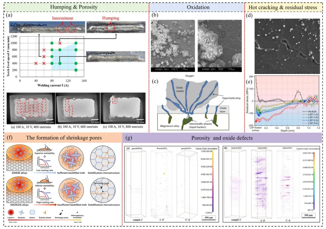- 熔基增材制造镁合金常见缺陷包括溅射、孔隙、元素损失、球化和裂纹,其形成与粉末特性、能量输入、路径规划和工艺参数相关;利用数值模拟分析镁合金增材制造过程的热行为和动力学,可探索最优工艺窗口并预测性能。