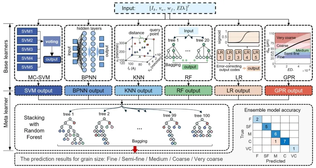 图 1 镁合金及镁基复合材料增材制造概述(图片来源:参考文献 [19, 58, 74, 112, 184, 227, 270])图 2 各类丝弧定向能量沉积技术对比 [36-38]图 3 镁合金 WA-DED 工艺中的缺陷:(a) 驼峰和孔隙 [36];(b) 氧化 [45];(c) 氧化结节内部结构 [46];(d) 热裂纹 [55] 和 (e) 沿深度方向的残余应力分布 [52];(f) 收缩孔隙 [53];(g) 孔隙和氧化缺陷 [54]图 4 (a) 镁合金沉积过程中 CMT 特性对波形、金属过渡行为及宏观形貌的影响 [58];(b) 液滴受力分析 [60];(c) 镁合金构件宏观结构 [64];(d) 不同模拟参数下的液滴速度 [59]图 5 WA-DED AZ31 合金晶粒尺寸预测的集成学习方法 [68]图 6 WA-DED AZ 系列合金微观结构:(a) AZ31 合金 [190];(b) AZ80 合金 [86];(c) AZ91 合金 [88]图 8 WA-DED 沉积 RE-Mg 合金微观结构图 10 (a) 合金高温压缩前后金相组织分布、等效应变云图、KAM 直方图及有限元模拟结果 [146];(b) 动态再结晶(DRX)机理图 [148]图 11 密排六方(HCP)晶格中空位介导的扩散跳跃示意图 [149]图 12 (a-b) AZ91 镁合金析氢测试和失重测量结果 [151, 153, 154];(c) 镁腐蚀过程中电荷转移的第一性原理分析 [157];(d) WAAM AZ31 合金脱氧化层表面形貌和腐蚀截面形貌 [159];(e) 浸泡后的腐蚀形貌 [155]图 14 场辅助增材制造(FAAM)镁合金微观结构演变图 21 LPBF 镁合金后处理过程微观结构演变示意图图 22 (a) 增材制造和传统方法制备镁 - 稀土合金拉伸性能汇总图 [287];(b) 文献中 LPBF 制备的其他铸态镁合金 [273]图 25 基于搅拌摩擦工程的固态增材制造(SSAM)图 26 AFSD 沉积 WE43 合金工艺优化过程中的形貌 [324]图 29 FSAM 制备 WE43 合金不同位置晶粒分布 IPF 图 [333]图 30 制备 MMC 构件的 WAAM 工艺示意图图 31 WAAM SiC/AZ31 样品 SEM 分析结果 [351]图 32 LPBF 制备 AZ91-SiC 样品力学性能及 SiC 生长控制作用 [361]图 34 (a) FSP 制备 MMC 示意图和 (b) 颗粒分布 [380]- 熔基和摩擦搅拌基增材制造工艺均已用于镁及其复合材料生产:WA-DED 适用于制造大型复杂镁合金构件,力学性能可与锻件媲美,但焊丝材料种类是主要限制因素;LPBF 在构件尺寸精度、成分调控和生物医学应用方面具有优势;摩擦搅拌基增材制造工艺可避免凝固缺陷,在功能梯度材料和层状复合材料生产中具有独特潜力。