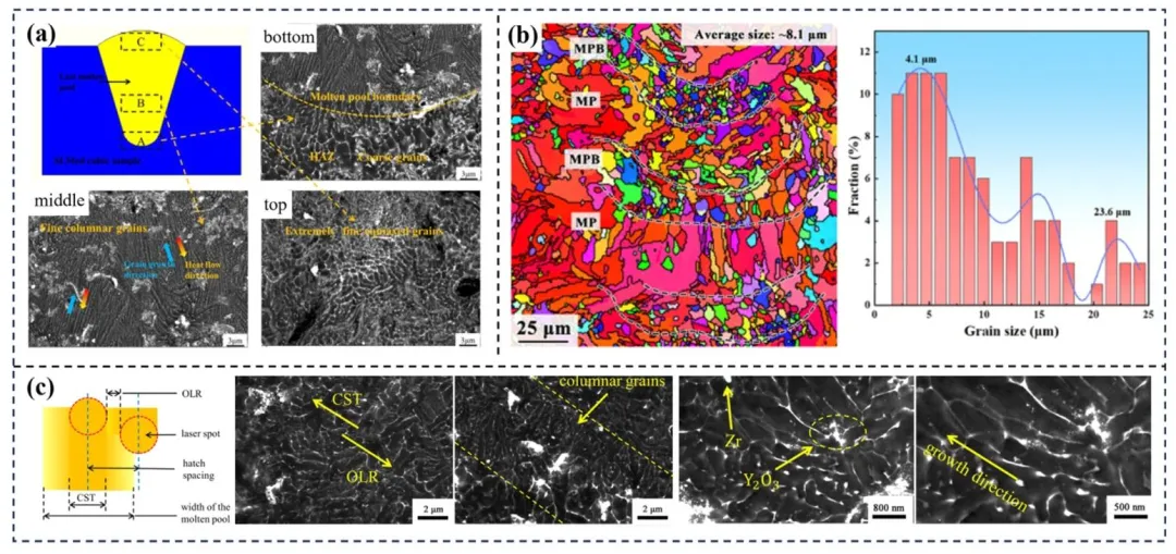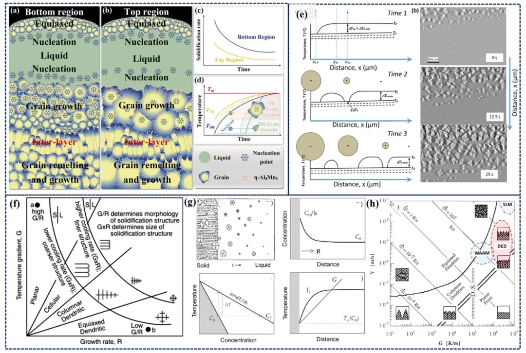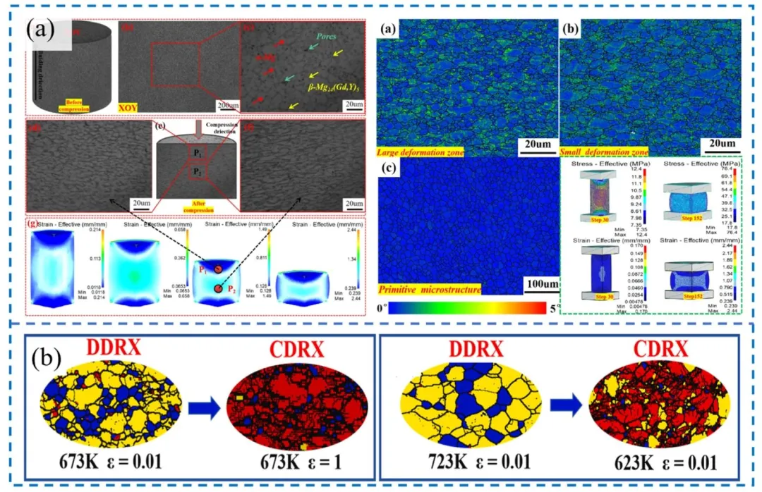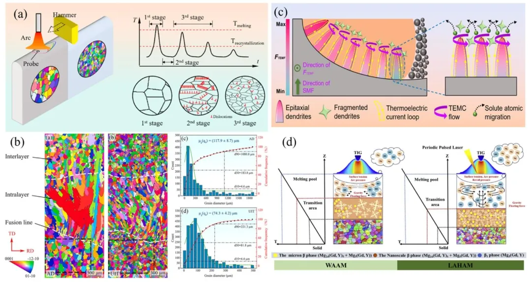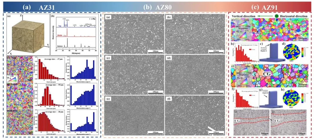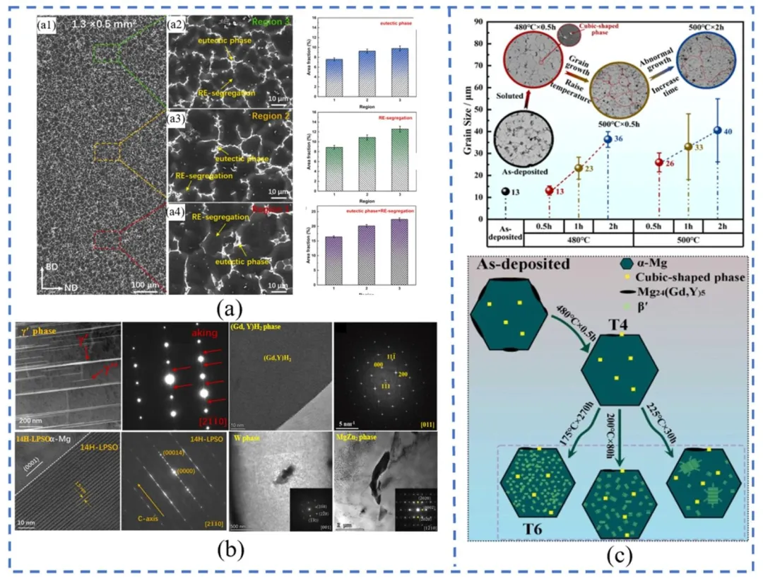 - 微观结构演变规律增材制造的多热循环和快速凝固特性导致镁合金构件微观结构异质性,WA-DED 制备的 AZ 系列合金呈现非平衡凝固微观结构,底部区域晶粒更细;Mg-RE 系列合金中稀土元素可显著提升耐热性和高温强度,形成 LPSO 相(长周期堆垛有序结构)等强化相;LPBF 工艺因更小熔池和更快凝固速率,形成更复杂的双峰异质微观结构;SSAM 通过动态再结晶实现晶粒细化,不同区域微观结构受局部温度和应变差异影响。