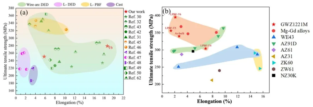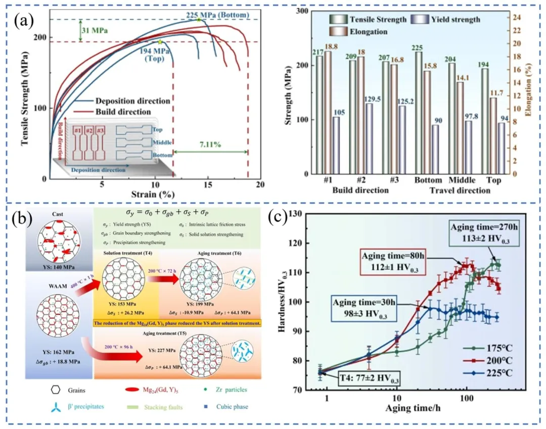 - 力学性能:WA-DED 构件力学性能优于传统铸造工艺,Mg-RE 合金的屈服强度通过 intrinsic 晶格摩擦应力、晶界强化、共晶强化、固溶强化、沉淀强化和 LPSO 相强化等六种机制叠加实现;LPBF 构件经时效处理后强度显著提升,WA-DED 和 SSAM 构件均表现出良好的强韧性协同。