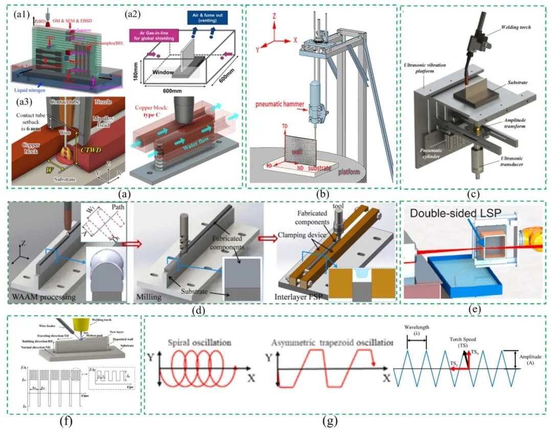 - 辅助技术应用:场辅助增材制造(FAAM)包括主动冷却、塑性变形、熔池搅拌等方式,如超声波振动可细化晶粒、消除性能各向异性;激光冲击喷丸(LSP)可引入纳米晶和残余压应力,提升耐腐蚀性。