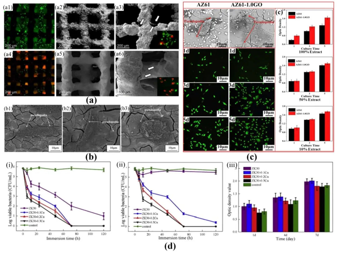 - 生物相容性:LPBF 可定制医用镁合金复杂结构,添加 Zn、Mn、Ca 及低毒稀土元素可降低腐蚀速率,经等离子电解氧化(PEO)等表面改性后,细胞代谢活性和增殖能力显著提升。