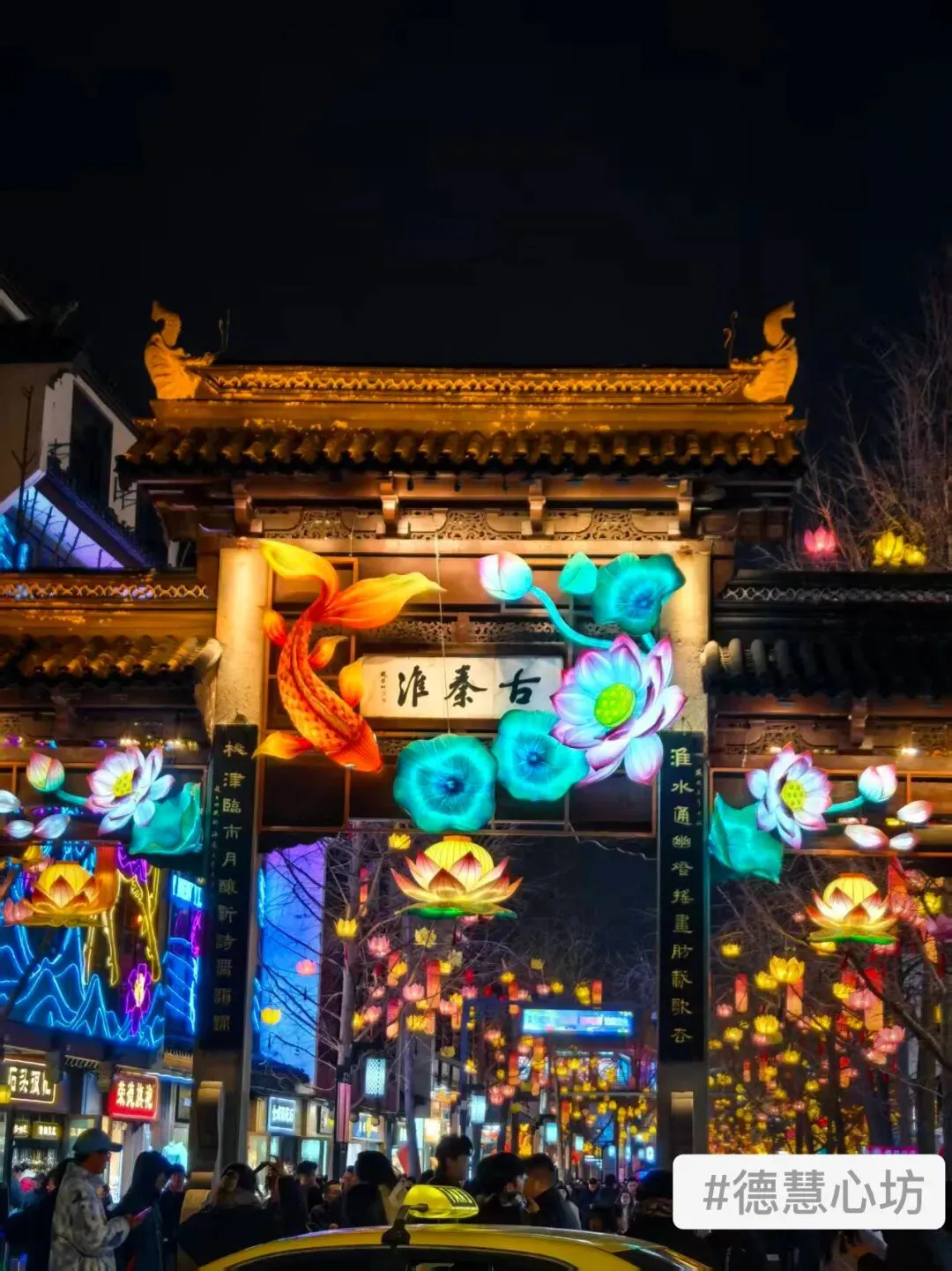随后我们打车前往夫子庙。夜色里的夫子庙热闹非凡,飞檐翘角,灯火璀璨,秦淮河波光粼粼,游船轻摇,人声与灯光交织成最暖的人间。这里比成都街子古镇更热闹,像成都宽窄巷子,也像北京王府井,人山人海;恰逢春节前夕,各类灯光秀、巨型马形灯饰、纳福灯会格外亮眼。