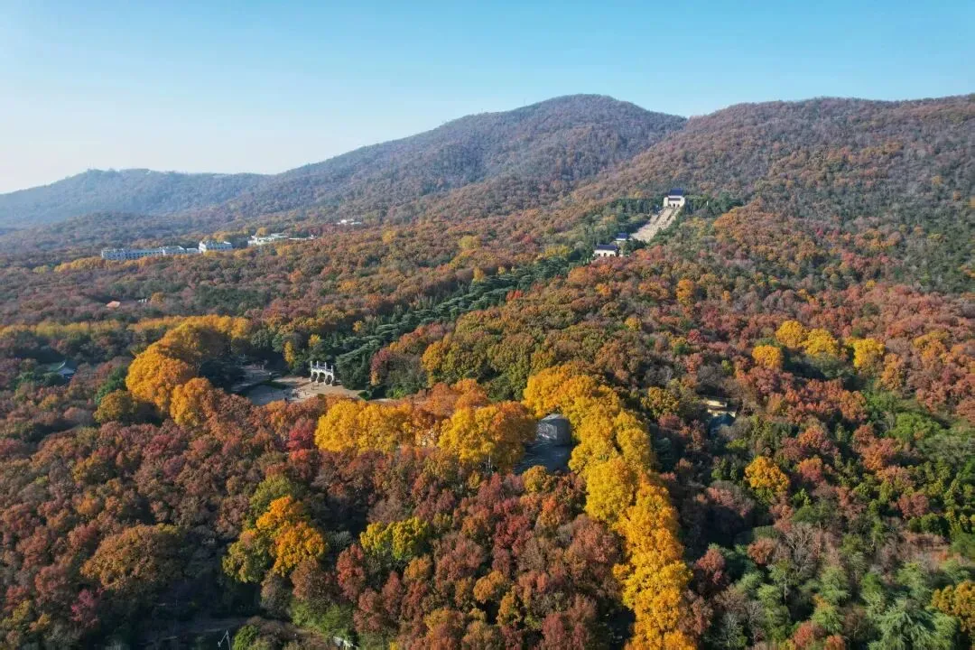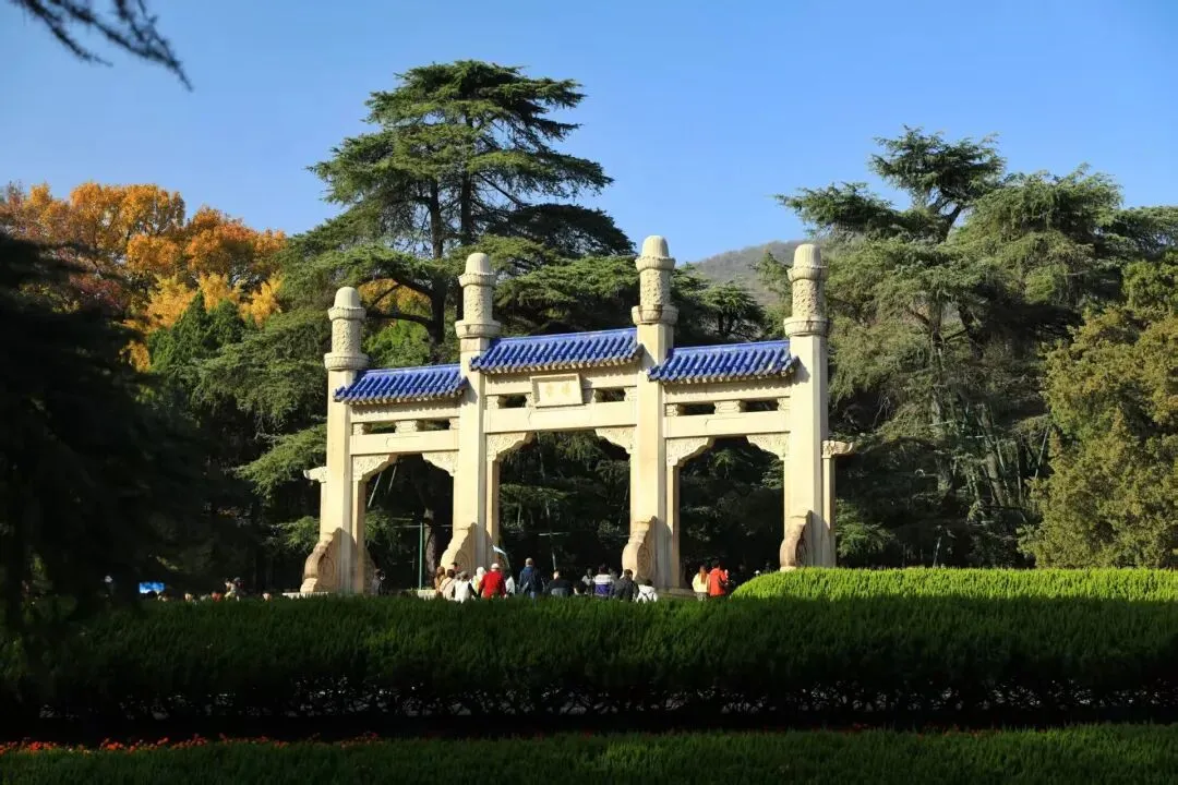 中山陵建筑群依山势而建,由南往北沿中轴线逐渐升高,主要建筑有博爱坊、墓道、陵门等,排列在一条中轴线上,从空中往下看,像一座平卧在绿绒毯上的“自由钟”。