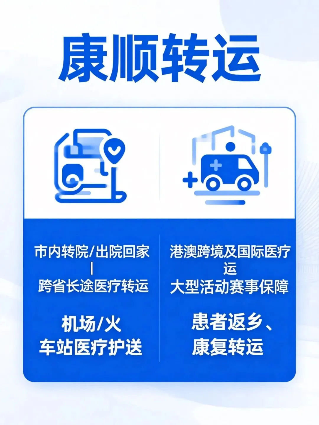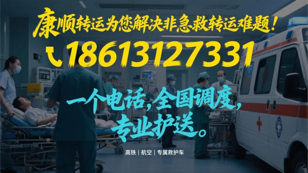 康顺转运是正规120非急救转运服务机构,服务项目包括:市内转院、跨省长途、机场车站医疗护送、港澳跨境及国际包机转运,以及活动赛事保障、患者返乡、康复疗养接送、复诊透析专车等。电话/微信:18613127331,随时为您服务,全天待命,快速出车,车内专业设备完善,医护全程陪同。