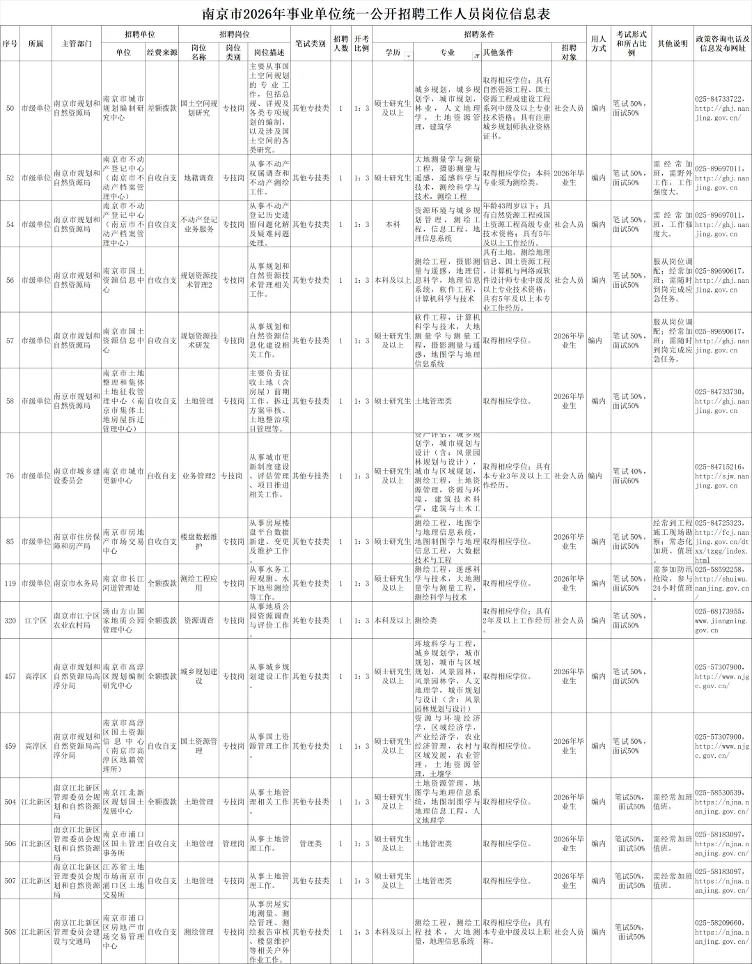 招聘单位政策咨询:联系电话请见《南京市2026年事业单位统一公开招聘工作人员岗位信息表》(附件1);