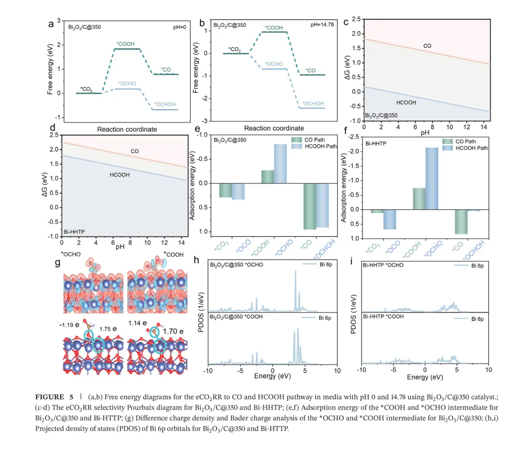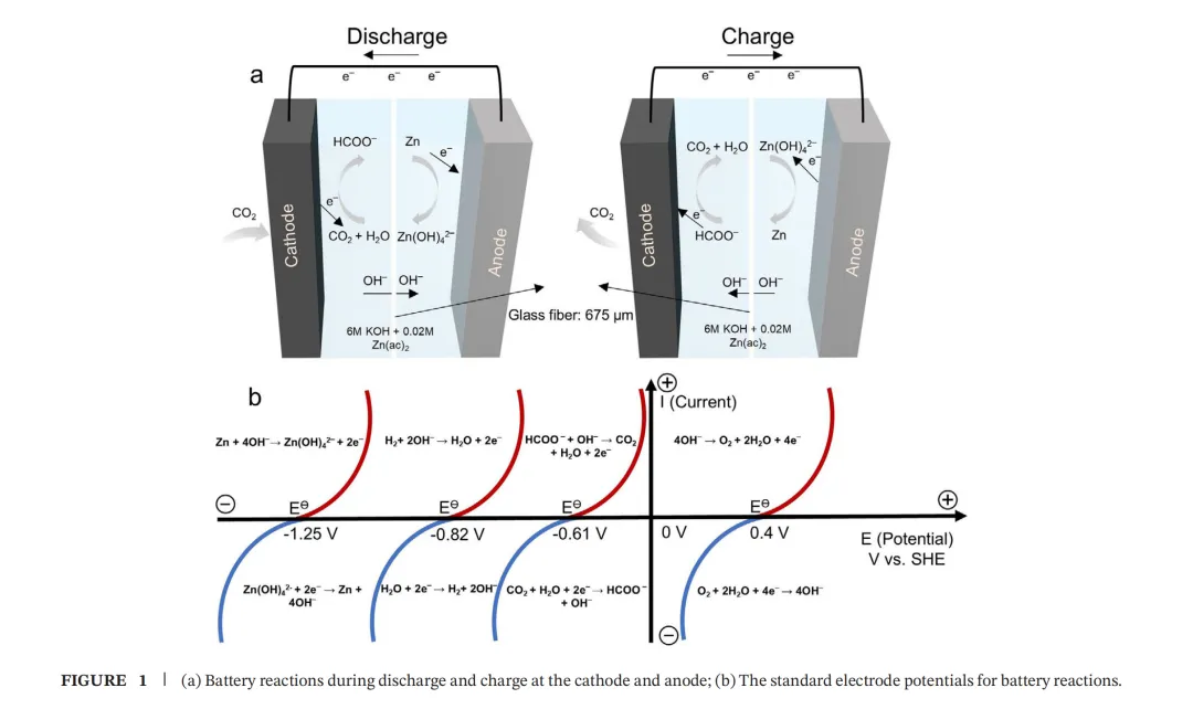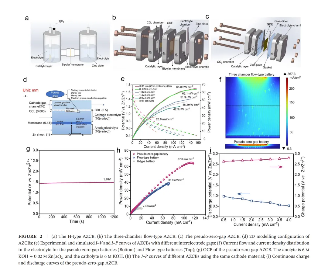 水系锌-二氧化碳电池(AZCBs)能够同时发电并将CO₂转化为有价值的产品,但其发展受到传质差、反应活性低等问题的限制。本文开发了具有流动CO₂气体和电解液、气体扩散阴极,特别是准零极间距特征的AZCBs。通过在准零间隙AZCB中采用碳包覆氧化铋(Bi₂O₃/C)作为阴极,实现了创纪录的峰值功率密度67.0 mW cm⁻²(电流密度为117.5 mA cm⁻²),并展现出超过600次循环的优异循环性能。具体而言,近零极间距通过在CO₂电还原反应界面建立增强的浓度梯度,显著促进了氢氧根离子传输和CO₂扩散。理论模拟进一步表明,由于通过*OCHO中间体在铋位点上的有利*O吸附,甲酸产物的优先生成源于其相比CO路径更低的能垒。这项工作所开发的AZCBs在模拟火星大气中能够高效稳定运行,对未来人类火星探索具有广阔前景,为同时实现能源供应和CO₂资源化利用提供了潜在解决方案。