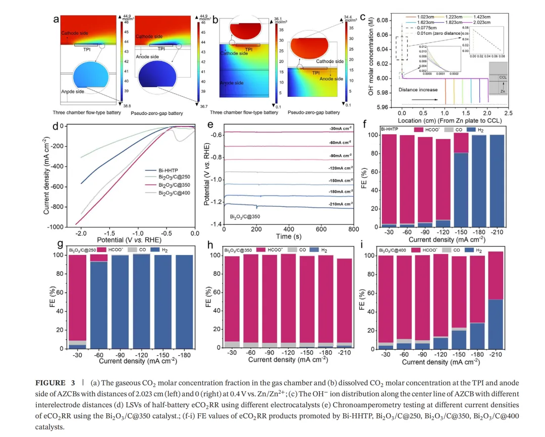 (1)该近零间隙AZCB展现出远优于H型和流动型电池的性能,具有高达67.0 mW cm⁻²的峰值功率密度、0.57 V的放电电位和117.5 mA cm⁻²的电流密度,同时具备超过600次循环的优异稳定性。所制备的准零间隙AZCB的优异电池性能源于氢氧根离子和CO₂传质的显著促进,以及Bi₂O₃/C@350催化剂高效且选择性的CO₂电催化转化能力。