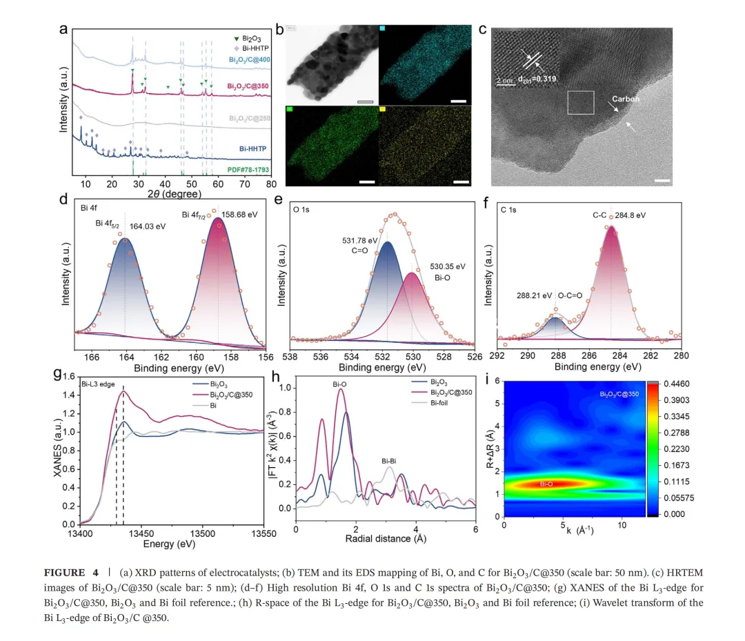 碳包覆氧化铋的合成:将Bi-HHTP置于管式炉中,控制升温速率为3.5 ℃/min,在空气中350 ℃煅烧90分钟。冷却至室温后,收集黄色产物。Bi₂O₃/C@250和Bi₂O₃/C@400的制备方法与Bi₂O₃/C@350相同,煅烧温度分别为250 ℃和400 ℃。