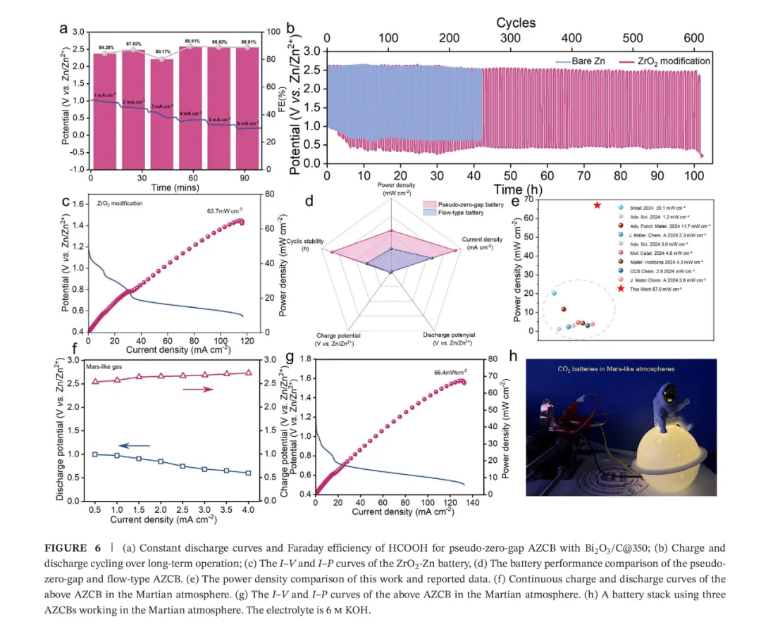 (3)这反过来又极大地进一步提升了电池性能,构成了电池性能与传质之间的双向促进机制,这种零间隙AZCB在类火星大气环境下同样表现出优异性能,为火星探索提供了一种极具前景的能源与原料解决方案。