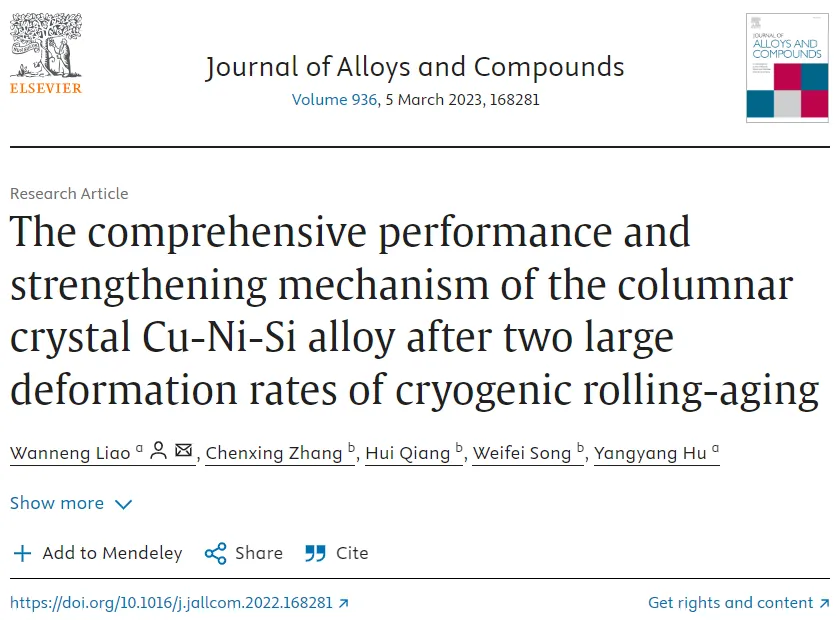 南京航空航天大学[J ALLOY COMPD]: 大变形量双道次深冷轧制 - 时效处理后柱状晶 Cu-Ni-Si 合金的综合性能及强化机制