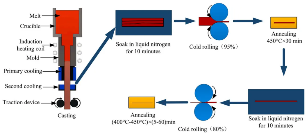 实验采用成分为 Cu-2.79Ni-0.58Si-0.1Mg 的 C70250 铜合金,通过差示扫描量热法测得该铜合金的液相线和固相线温度分别为 1089℃和 1054℃。将铸锭去除表面杂质后,在定向凝固炉中于 1200℃下熔化,保温 10min 后,启动牵引辊进行定向凝固操作。本试验采用的定向凝固参数如下:熔液温度 1200℃,铸造速度 10mm/min,冷却水流速 500L/h。对带坯进行变形量 95% 的深冷轧制,深冷轧制工艺为将试样浸入液氮后进行多道次轧制,每道次压下率 20%,每道次轧制后立即将试样浸入液氮 10min,随后在 450℃下时效 30min。紧接着,对时效后的试样进行变形量 80% 的二次深冷轧制,最后将试样分别在 400℃、450℃和 500℃下进行 5min、15min、30min、45min 和 60min 的最终时效处理,工艺示意图见图 1。