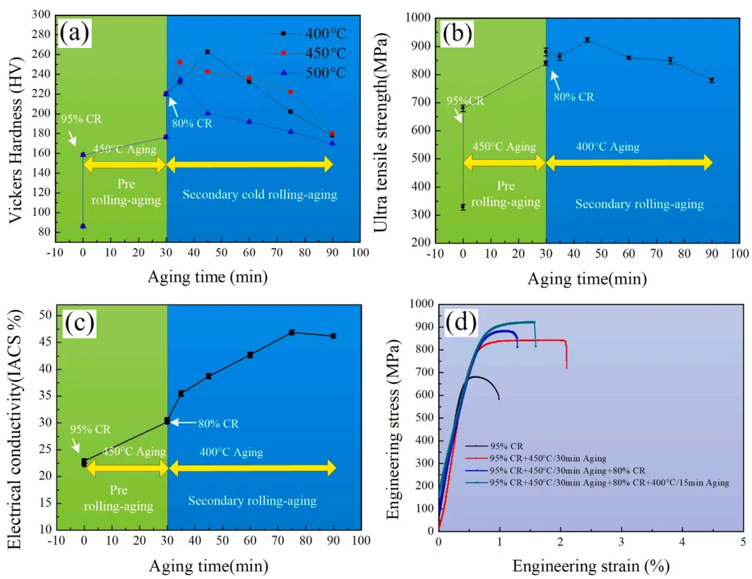 图 2 柱状晶 C70250 铜合金两道次大变形量深冷轧制 - 时效过程中的性能变化:(a) 硬度;(b) 抗拉强度;(c) 电导率;(d)应力 - 应变曲线