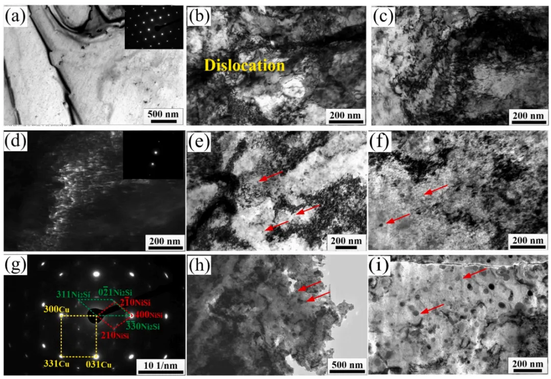 一般而言,时效态铜合金的强化效果主要源于基体中细小的析出相对高密度位错运动的阻碍作用,而高电导率则归因于纯 Cu 基体的特性。在 Cu-Ni-Si 合金中添加微量合金元素,可在时效过程中形成新型析出相,进而同步改善材料的力学和电学性能。除添加微合金元素外,形变热处理也是提升合金综合性能的有效方法。研究人员对 Cu-Ni-Si-Cr 合金开展预变形试验,发现 60% 的预变形量可使合金屈服强度从 559MPa 提升至 667MPa,提升幅度达 19.3%,而电阻率仅从 39.3nΩm降至 38.4nΩm,降幅仅为 2%。另有研究通过多道次冷加工变形 - 时效处理改善 CuNi3Si1Mg 合金的力学和电学性能,与未变形状态相比,合金的抗拉强度提升76%,电导率提升 6.4%。在此过程中,Cu 基体内部的溶质原子可沿位错发生拖曳或迁移,从而促进析出相的形成。此外,大量位错与析出相或晶界发生相互作用,使材料强度显著提升,但电导率通常会受到影响。对晶粒结构、位错和强化相进行多尺度调控,会显著影响材料的力学和电学性能。研究人员通过预冷轧在 Cu-Ni-Si-Zn-Cr-P 合金中引入大量缺陷,促进中间时效过程中析出相的形核,进而在后续轧制过程中产生更多位错,最终使合金的综合性能得到有效提升。还有研究通过连续挤压结合后续形变热处理对 Cu-Ni-Si-Zn-Cr 合金进行处理,获得含有细晶粒、大量析出相和位错的最终组织,使合金具备高抗拉强度、高电导率和良好的塑性。尽管科研人员在实现Cu-Ni-Si 合金高强度和高电导率方面付出了诸多努力,但从铸坯到成品薄带的制备过程仍面临诸多挑战。