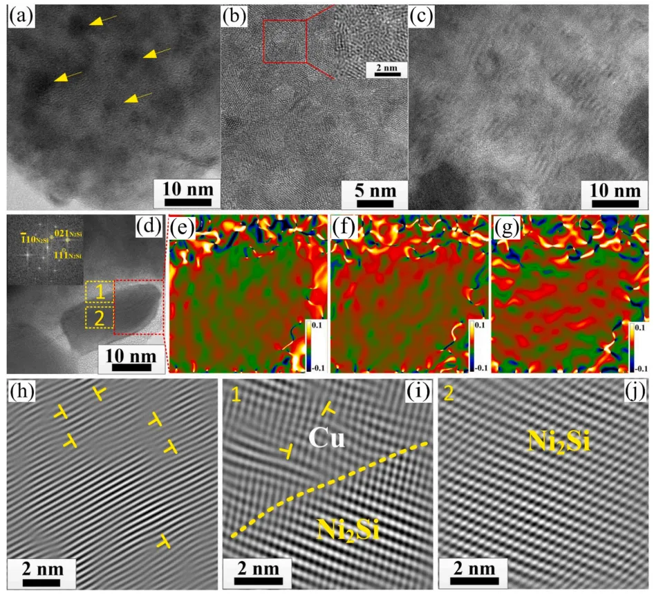 图 5 不同深冷轧制 - 时效状态下合金的高分辨透射电子显微镜图像:(a)(b) 95% 深冷轧制 + 450℃时效 30min 态;(c) 95% 深冷轧制 + 450℃时效 30min+80% 深冷轧制 + 400℃时效 15min 态;(d)二次时效态的大尺寸析出相;(e)(f)(g) 分别为图 5 (d) 中红色框选区域的几何相位分析应变场;(h) 为 (a)的局部傅里叶逆变换图像;(i)(j) 为 (d) 中 1、2 区域的傅里叶逆变换图像