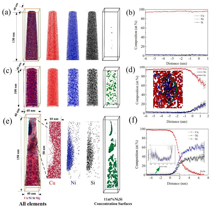 图 6 C70250 铜合金深冷轧制 - 时效过程中溶质原子的三维原子探针图像:(a)(b) 铸态合金中 Cu、Ni、Si 的原子分布图和一维浓度曲线;(c)(d) 一次时效态合金中 Cu、Ni、Si 的原子分布图和一维浓度曲线;(e)(f) 二次时效态合金中 Cu、Ni、Si 的原子分布图和一维浓度曲线