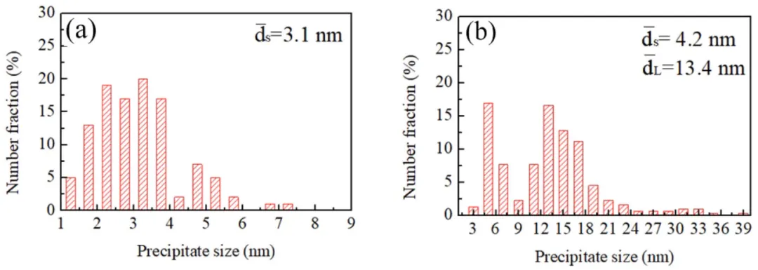图 7 一次时效和二次时效状态下合金析出相的尺寸分布:(a) 一次时效工艺;(b) 二次时效工艺