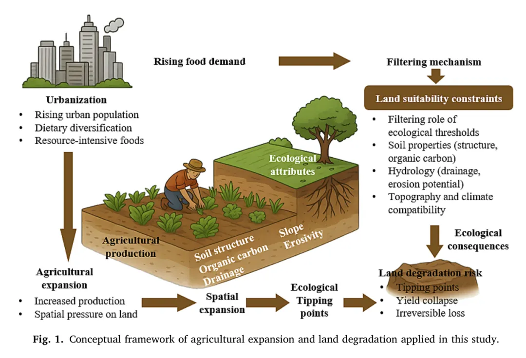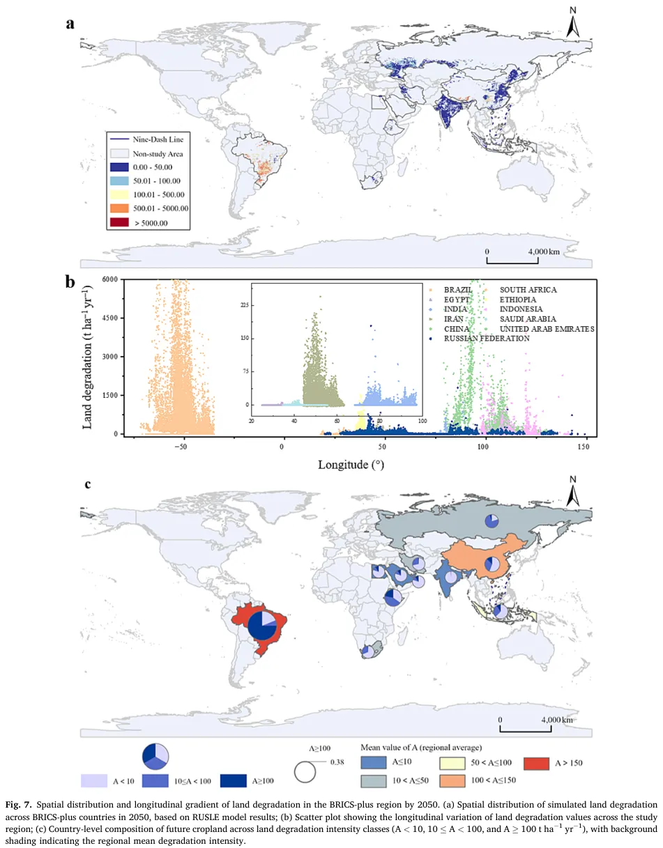 基于这些结果,土地退化强度进一步被纳入对未来粮食主产区的生物物理可用性的评估中。通过将未来粮食生产区域的空间分布与侵蚀强度、土壤有机碳含量和排水条件指数进行叠加,该分析确定了在给定的粮食需求和土地利用扩张路径下可能受到生物物理限制的农田区域,并评估了相关的潜在粮食供应损失。重要的是,此次评估并非单纯关注退化程度本身,而是考察在持续高强度使用的情况下,土地是否仍能维持稳定的粮食安全状况。