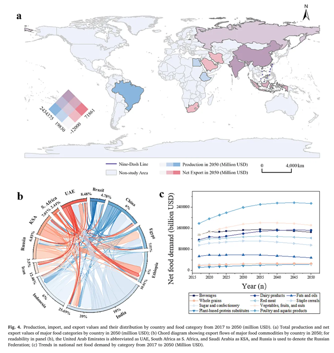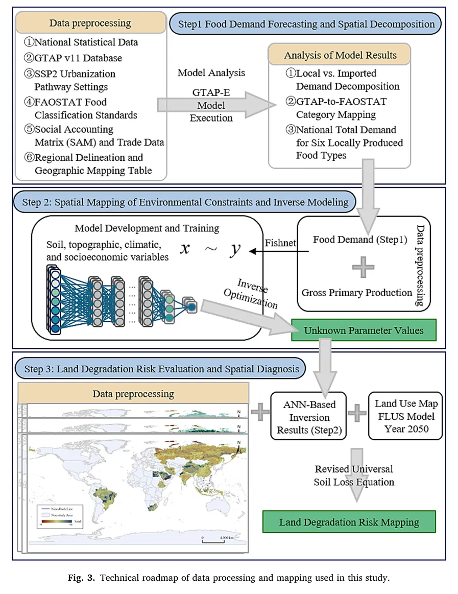 研究采用三阶段的方法论框架(图3)。第一阶段,在快速城市化发展路径下,利用可计算一般均衡(CGE)模型生成食品需求预测(第3.3.1节)。该情景反映了在“一切照旧”(BAU)发展轨迹下,人口增长和收入驱动的膳食结构扩张。该模型对2050年选定国家及各类食品的食品需求进行了细分估算。这些估算同时涵盖国内生产和国际贸易流量,从而综合反映了国家饮食偏好与跨境农业贸易的双重影响。
