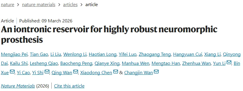 链接: Pei, M., Gao, T., Liu, L. et al. An iontronic reservoir for highly robust neuromorphic prosthesis. Nat. Mater. (2026). https://doi.org/10.1038/s41563-026-02532-7(阅读原文直达链接)