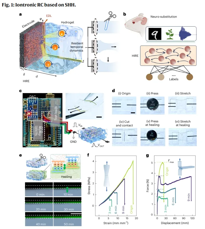 这篇题为 “An iontronic reservoir for highly robust neuromorphic prosthesis” 的文章发表于 Nature Materials。作者构建了一种基于水凝胶的离子型储备池,称为 HIRE(hydrogel-based iontronic reservoir)。器件采用三端平面结构,以 PAA/PEI 自愈水凝胶作为介质层,以 laser-induced graphene(LIG) 作为电极,其核心动态来源于石墨烯/水凝胶界面的电双层(EDL)调控。