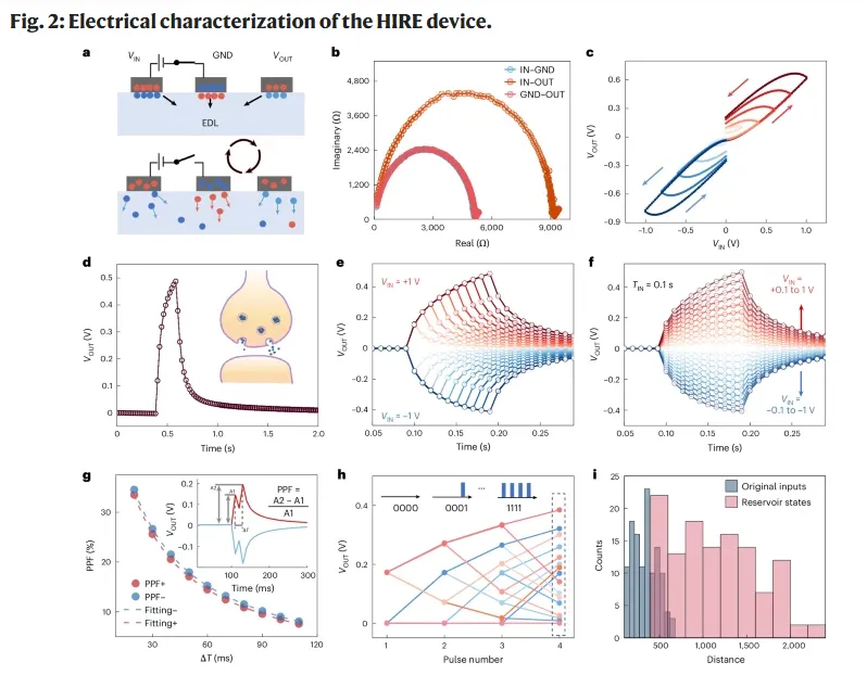 如果从整篇文章的位置来看,Figure 1 的作用就是先把“平台”立住:读者在这里要先接受两个前提,一是这确实是一个依赖离子界面动态的器件,二是这个器件的响应特征确实具备 reservoir 所需要的非线性和时间记忆基础。