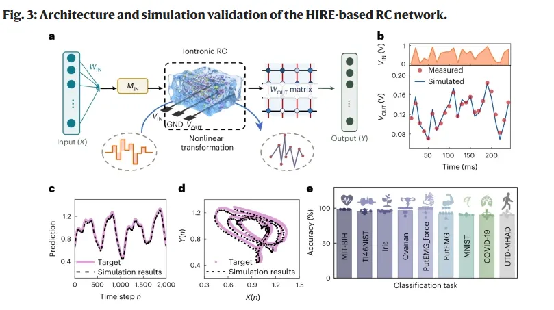 如果用更直白的话来说,这个器件的关键不在于体材料内部发生了多么复杂的相变或重构,而在于一个很薄的离子界面本身就能够提供非线性响应和短时记忆。这使得它天然适合作为储备池中的动态节点:输入信号进入之后,会在器件中留下带有时间特征的响应“痕迹”,这些痕迹进一步展开成更容易区分的内部状态,再交给后面的读出层完成任务。