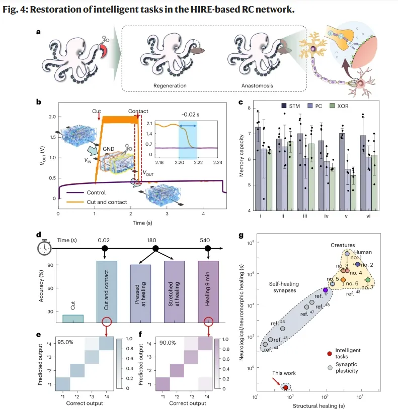 更进一步,这篇文章最有特点的地方并不只是“做了一个能跑储备池的器件”,而是把这个储备池平台和高鲁棒性结合在了一起。作者使用的水凝胶本身具有自愈能力,而器件的关键功能层又集中在纳米尺度的离子界面,因此当器件受到切断等机械破坏后,只要重新接触,功能就可以非常快地恢复。文章中给出的结果是,切断后的器件在重新接触后大约 0.02 s 内就能恢复工作,而且在语音识别任务中可以直接继续使用原先训练好的读出权重 Wout,不需要重新训练。