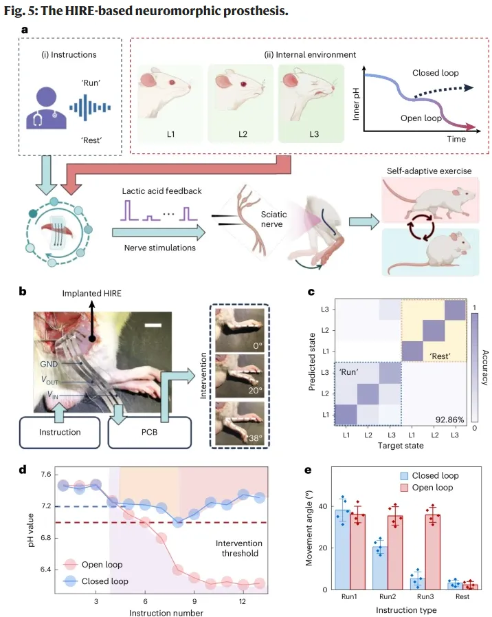 在此基础上,作者不仅验证了 HIRE 作为储备池的计算能力,还把它进一步组织成一个面向神经假体的闭环系统。这个系统一方面接收外部语音命令,另一方面还能感知局部 pH 变化,从而把“外部运动意图”和“内部疲劳状态”结合起来,动态调节对坐骨神经的刺激强度。换句话说,这篇文章真正想展示的,不只是一个离子型 RC 器件本身,而是一个从动态信息处理、快速功能恢复到闭环神经刺激控制都打通的神经形态假体平台。