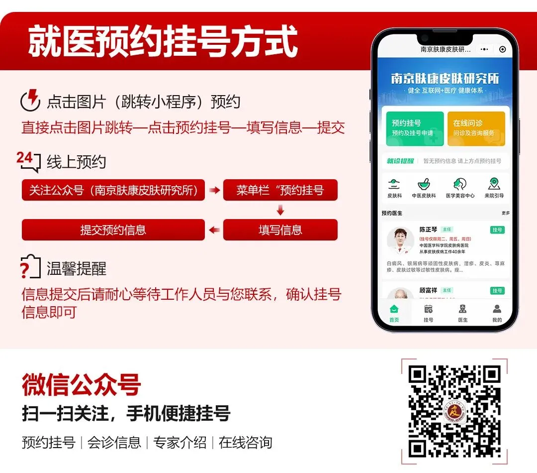搜索关注南京肤康皮肤病研究所官方认证公众号,进入底部预约挂号入口,提前实名绑定信息,选科室、医生、时段即可提交,操作最快最便捷。