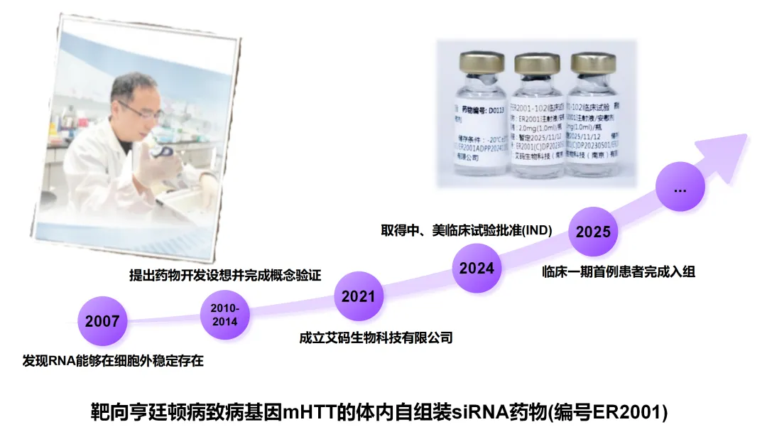 南京大学生命科学学院张辰宇教授团队基于其在细胞外核酸领域的系列突破性科学发现,创建了新一代的小核酸药物体内递送平台技术,使得小核酸药物的大规模临床应用变为可能。基于该平台技术研发的全球首个能够突破血脑屏障的小核酸治疗药物,可用于治疗亨廷顿舞蹈症。团队在关键节点获鼎晖投资并成立艾码生物科技有限公司,并与顶尖医疗机构建立深度合作,确保技术转化阶段快速获得临床支持,显著缩短研发周期,且在资深行业管理者设计的商业化路径下,采用里程碑式收费的独占许可模式,让技术价值在市场中落地生根。该成果是国内首个获中美“双报双批”的原创小核酸药物,并获FDA孤儿药资格认定,药物临床Ⅰ期试验正在顺利进行中。