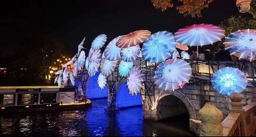 沿着河畔漫步,最先映入眼帘的是横跨秦淮河的石桥。整座桥被成排的灯伞精心装饰,红的、金的、蓝的灯伞层层叠叠,五光十色的光影在桥面上流转,像一条缀满繁星的彩带。桥下,画舫游船穿梭往来,船身的灯光与桥上的灯伞交相辉映,桨声灯影里,秦淮河的诗意被无限放大。西瓜妹妹趴在桥栏上,看着游船缓缓驶过,从容驻足,慢慢欣赏这 “灯映画舫、水载流光” 的美景,不用在人挤人中匆匆一瞥。