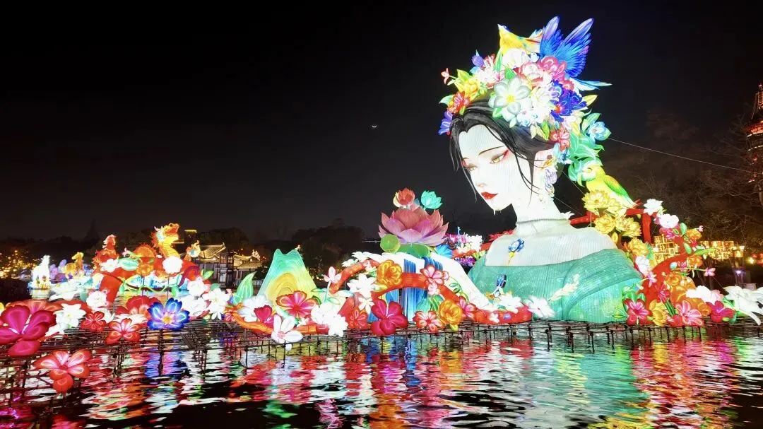 秦淮河中央,最让人惊艳的巨型仙女花灯群映入眼帘。这组花灯堪称本届灯会的 “颜值担当”,仙女身姿曼妙,衣袂飘飘,周身环绕着繁花与祥云。伴随着悠扬的古典音乐,花神的眼睛会缓缓睁开,灵动又逼真,仿佛从千年的梦境中苏醒