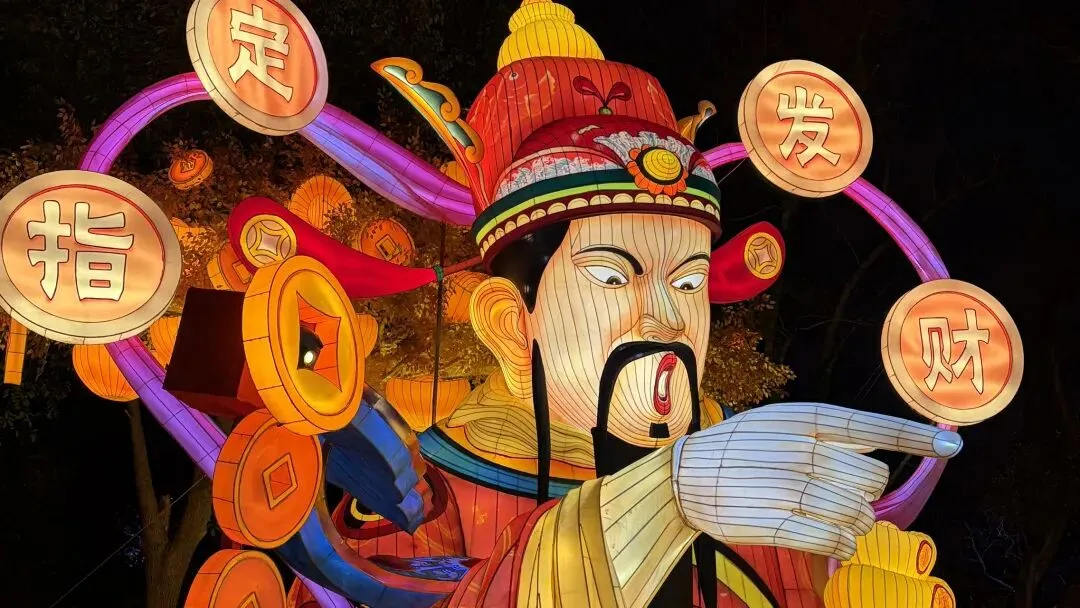 再往前走,巨型财神爷花灯吸引了我们的目光。财神爷身着红袍,面容喜庆,最有趣的是它的互动设计:当游人靠近,财神爷会缓缓抬起手指,指向你,同时响起 “指定发财” 的吉祥话语,氛围感拉满
