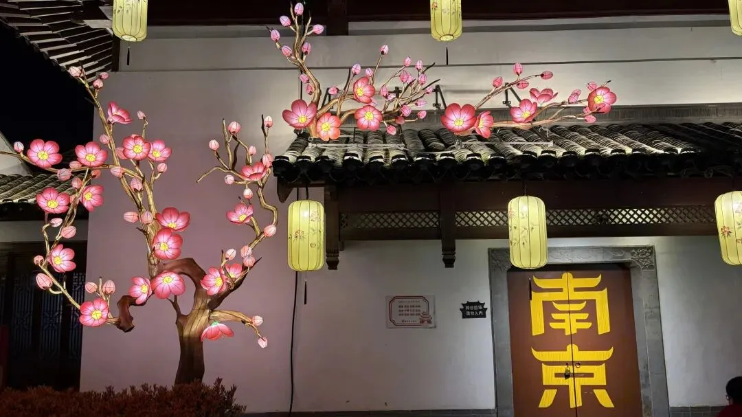 最后,来到了网红打卡点 —— 古朴的青砖白墙之上,巨大的 “南京” 二字醒目又大气,梅花型的花灯点缀在墙面与门楣,古韵与新意完美融合。这里是游客必打卡的地方,春节期间想必人满为患,而此刻,可以悠闲地站在门前,以 “南京” 花灯为背景,拍下专属的全家福。用镜头定格下这场错峰赏灯的美好。