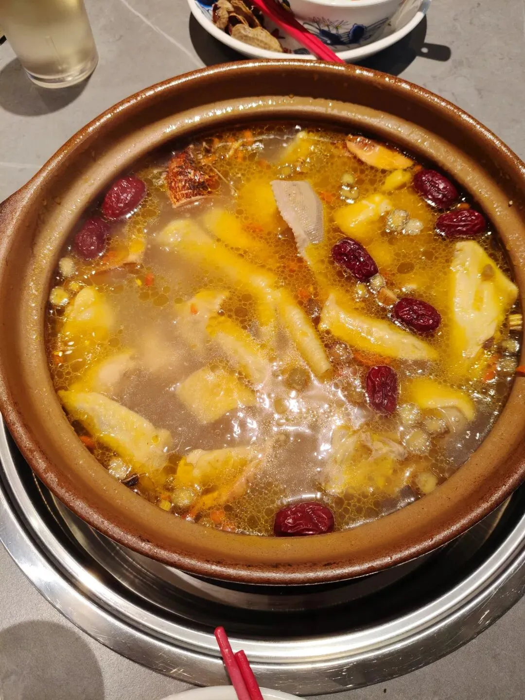 我们点了招牌人参果林走地鸡煲。锅一端上来,汤色清亮温润,缓缓冒着热气,鲜香缓缓散开,闻着就特别舒服。没有厚重油腻感,是很清爽的草本鲜香,温和不冲鼻。