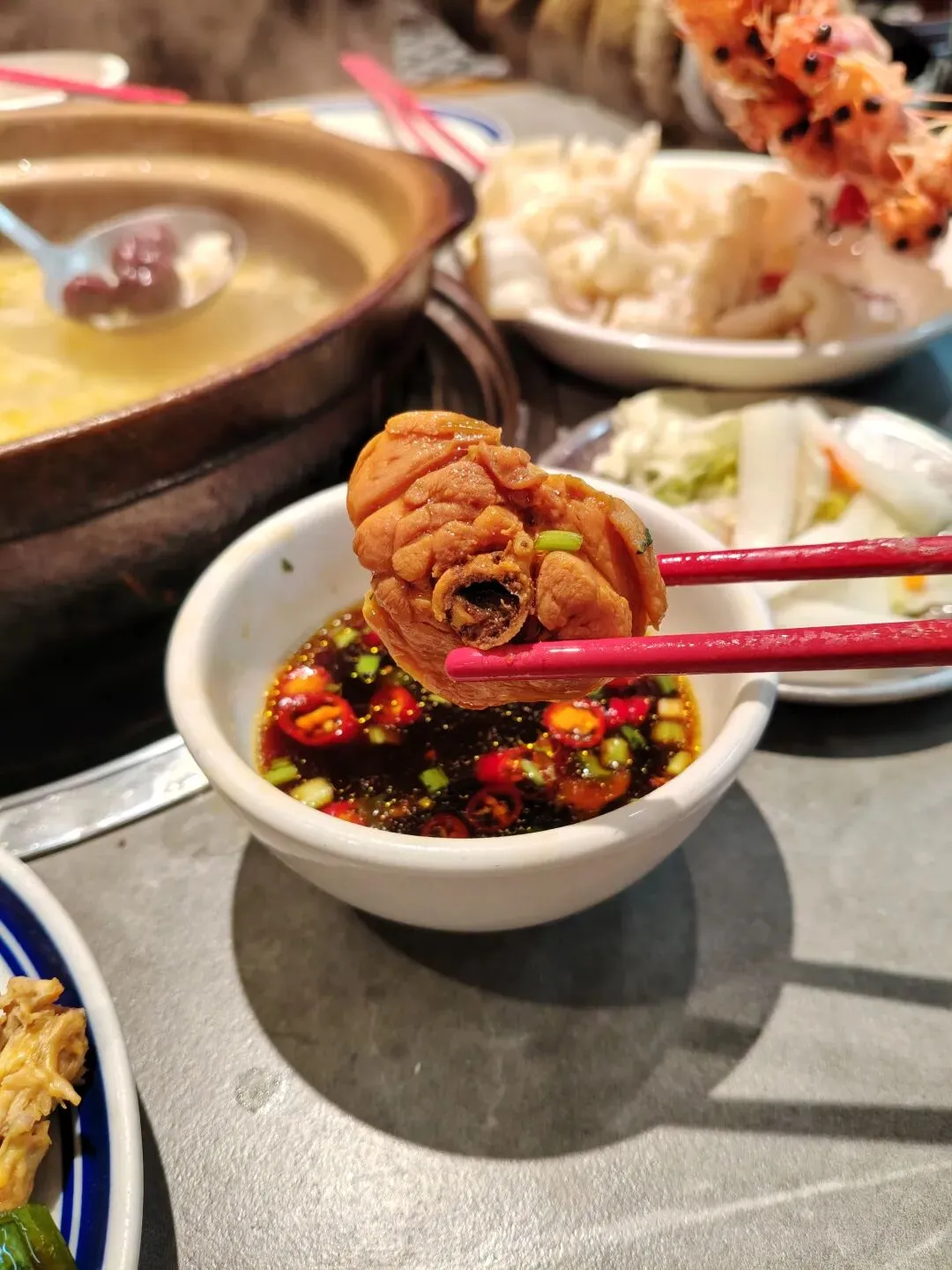 鸡肉用的是果林走地鸡,肉质紧实不柴,皮爽肉嫩,煮久了也不会烂糊糊的。汤底喝起来特别鲜,人参、红枣、枸杞的味道很柔和,清甜回甘,不苦不药味重,春天喝着温润又舒服。先喝汤、再吃肉,一口下去,从里到外都暖暖的。蘸上店里的秘制蘸料,咸香鲜辣,和鲜嫩的鸡肉配在一起,味道层次一下子就出来了,简单却越吃越上头。