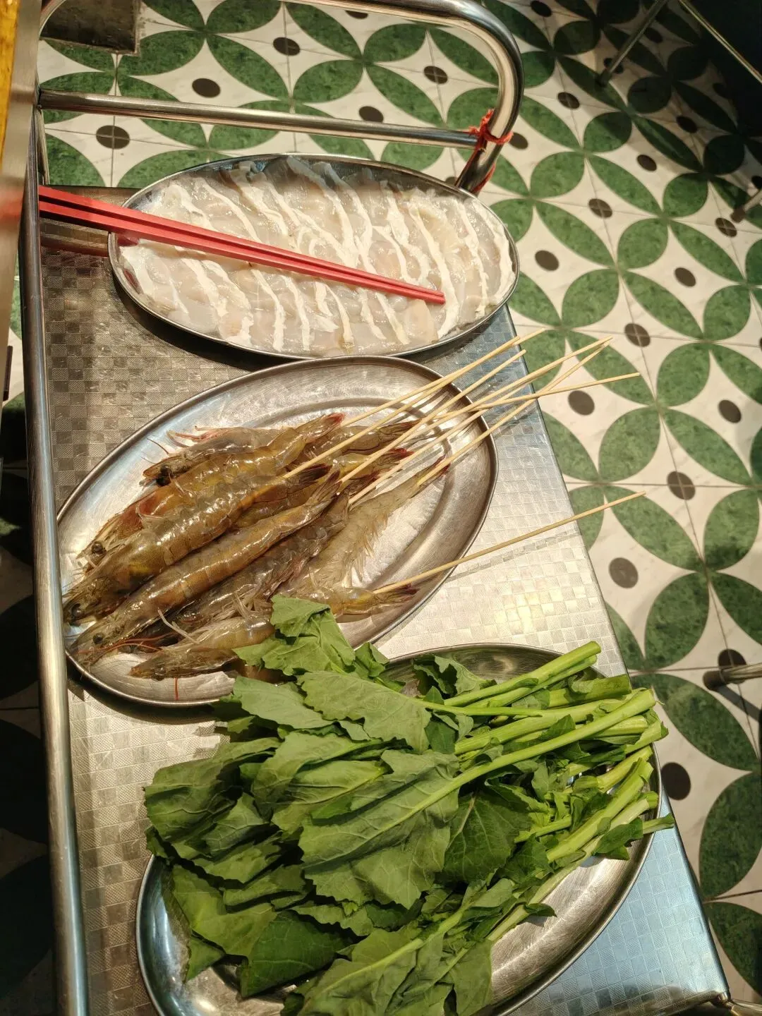 除了鸡煲,我们也加了几份配菜。鲜虾鲜甜弹牙,煮进鸡汤里鲜上加鲜;脆肉鲩口感爽脆,很特别;还有两种第一次见的蔬菜——灰树花和板蓝根苗,解腻又爽口。