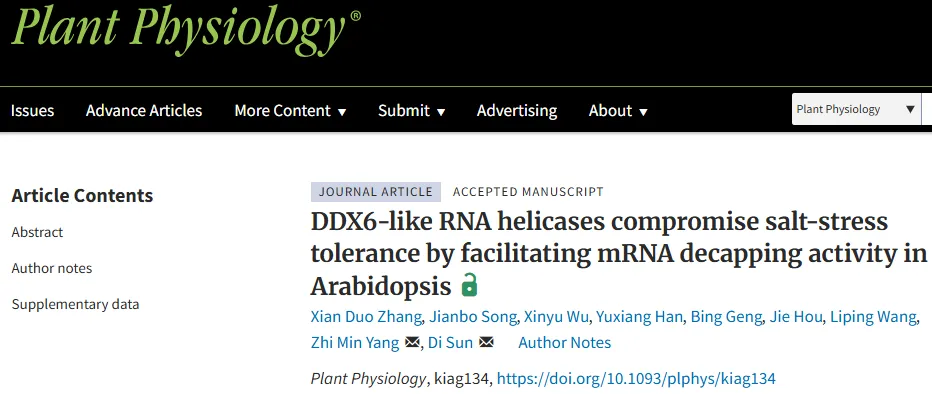 近期,南京农业大学杨杨志敏、孙迪团队在 Plant Physiology 在线发表题为 “DDX6-like RNA helicases compromise salt-stress tolerance by facilitating mRNA decapping activity in Arabidopsis” 的研究论文。研究系统揭示了DDX6类RNA解旋酶在拟南芥盐胁迫响应中的负调控作用,并阐明其通过促进mRNA去帽降解调控抗逆基因表达的新机制。