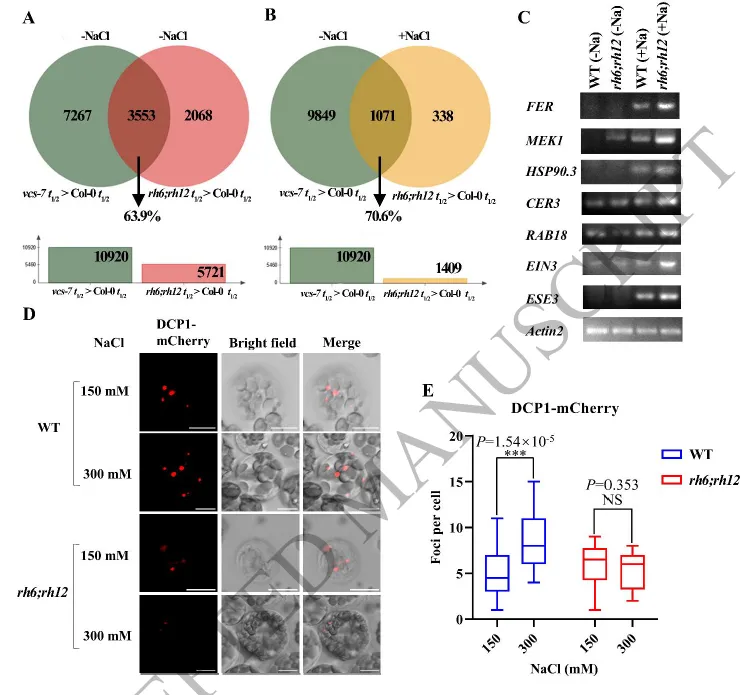 在机制研究方面,作者结合转录组测序与mRNA半衰期分析,发现DDX6类RNA解旋酶通过促进mRNA降解来调控盐响应基因表达。特别是在rh6;rh12双突变体中,大量盐胁迫响应基因的mRNA半衰期显著延长,其中约389个关键基因在盐胁迫下被稳定积累,从而增强植物耐盐能力。