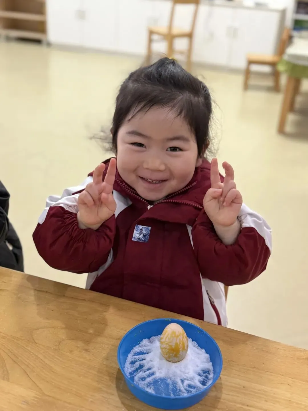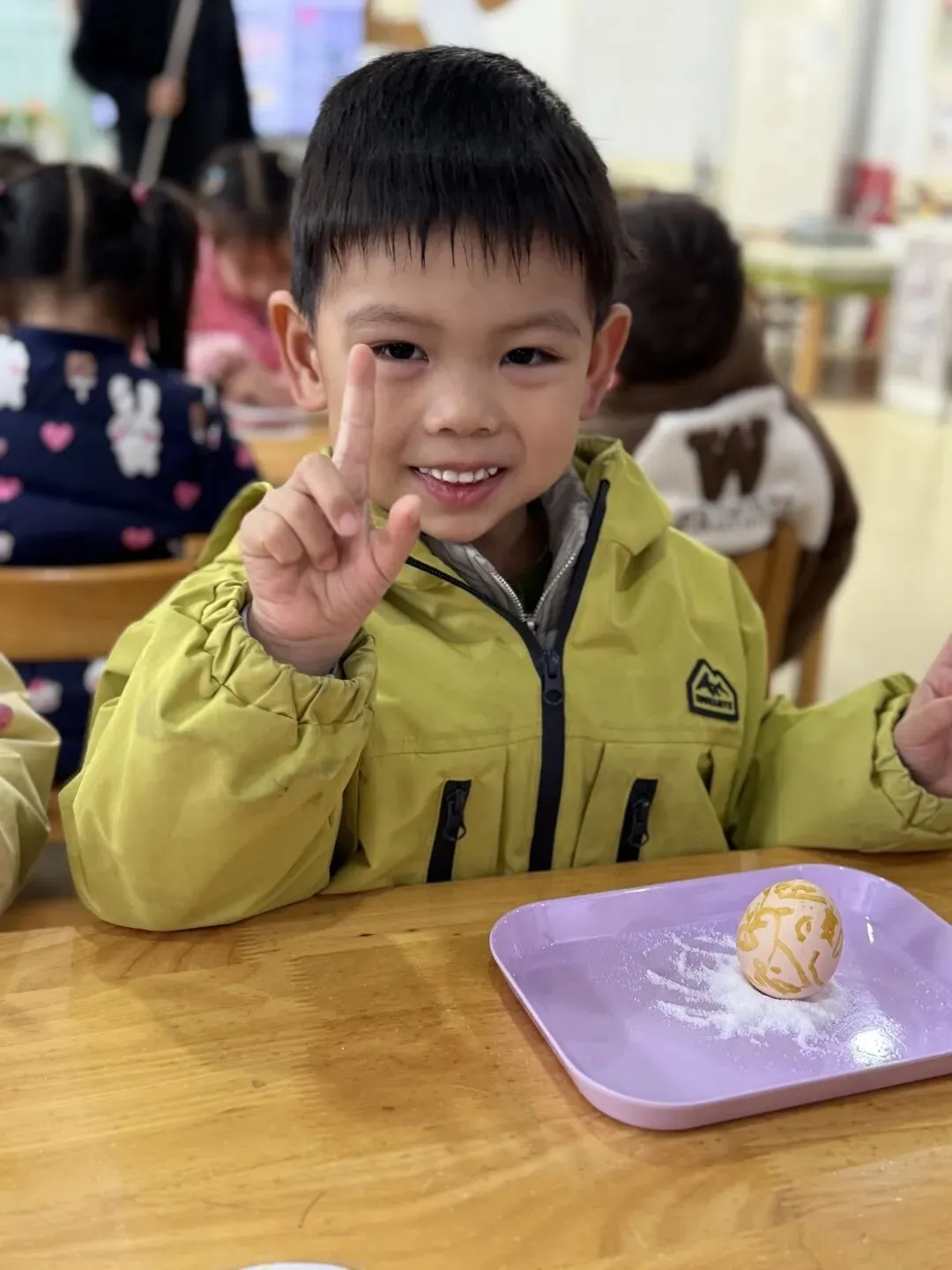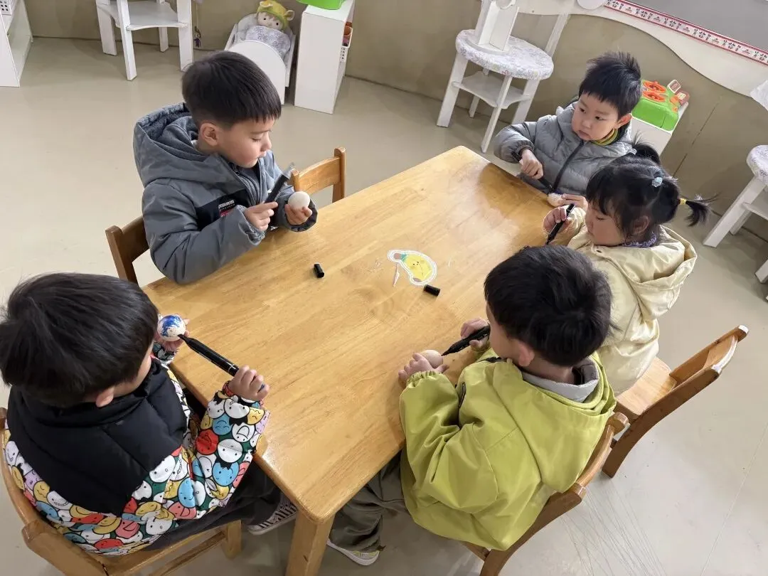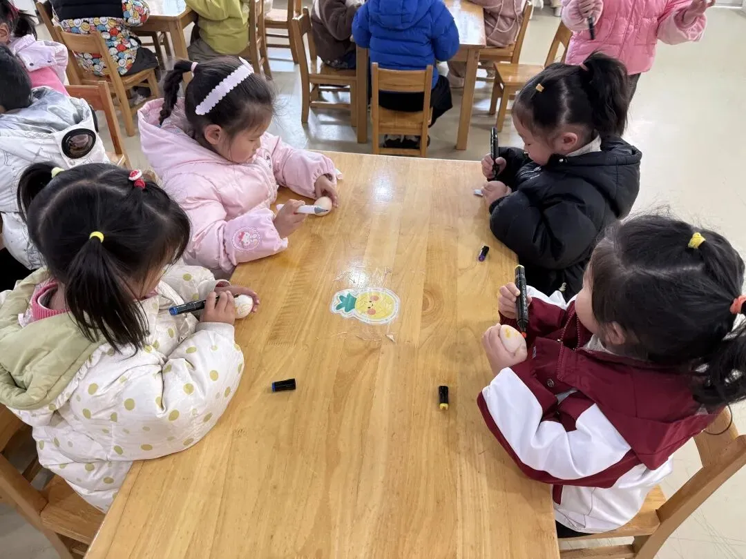 巧立鸡蛋,探索乐趣。涂鸦结束后,孩子们开启了趣味十足的春分立蛋挑战。在老师的引导下,他们尝试借助食盐的支撑力,让圆滚滚的鸡蛋稳稳站立。一次次尝试、一声声欢呼,孩子们在动手实践中感受春分传统习俗的奇妙,收获满满的成就感。