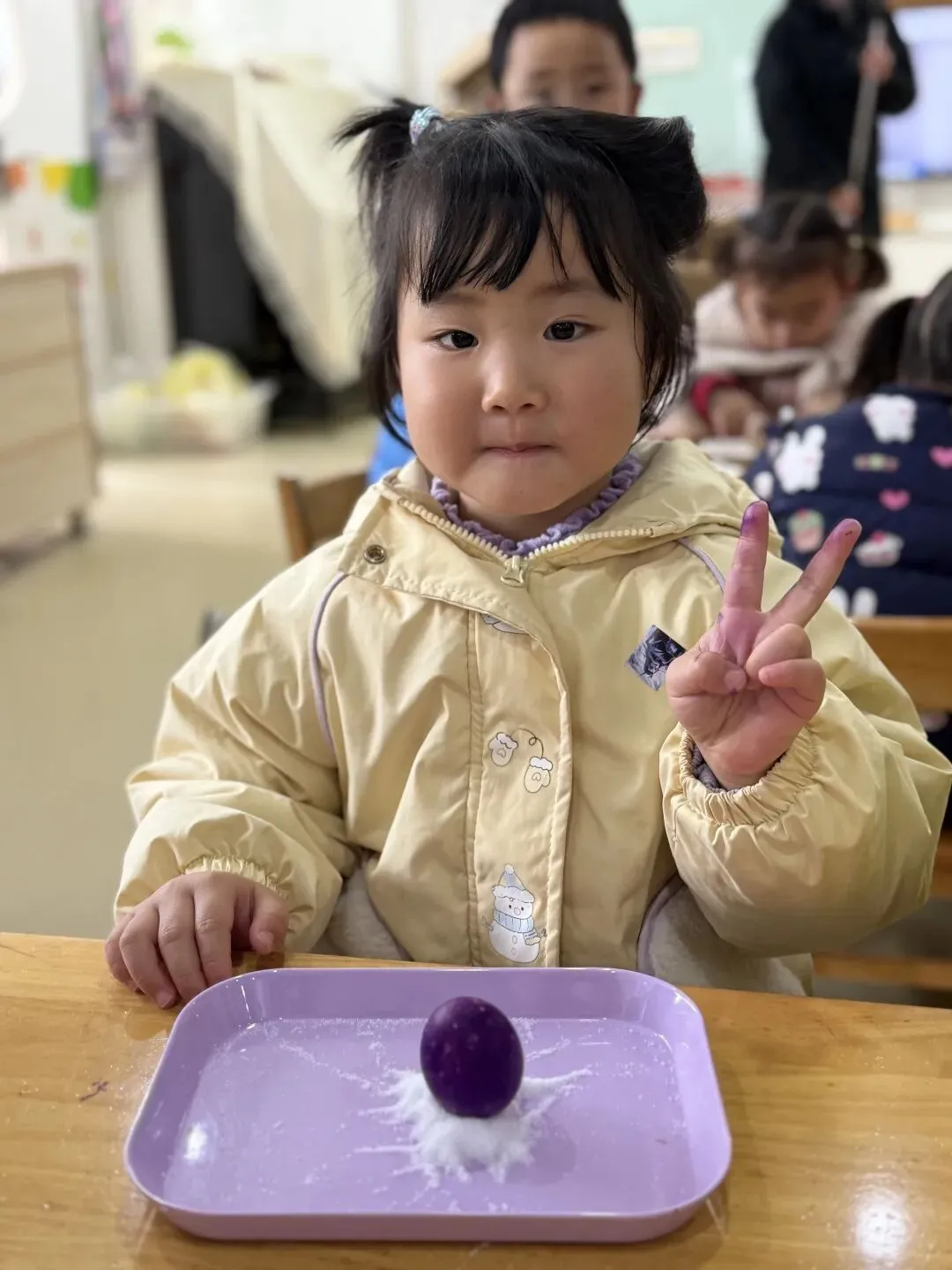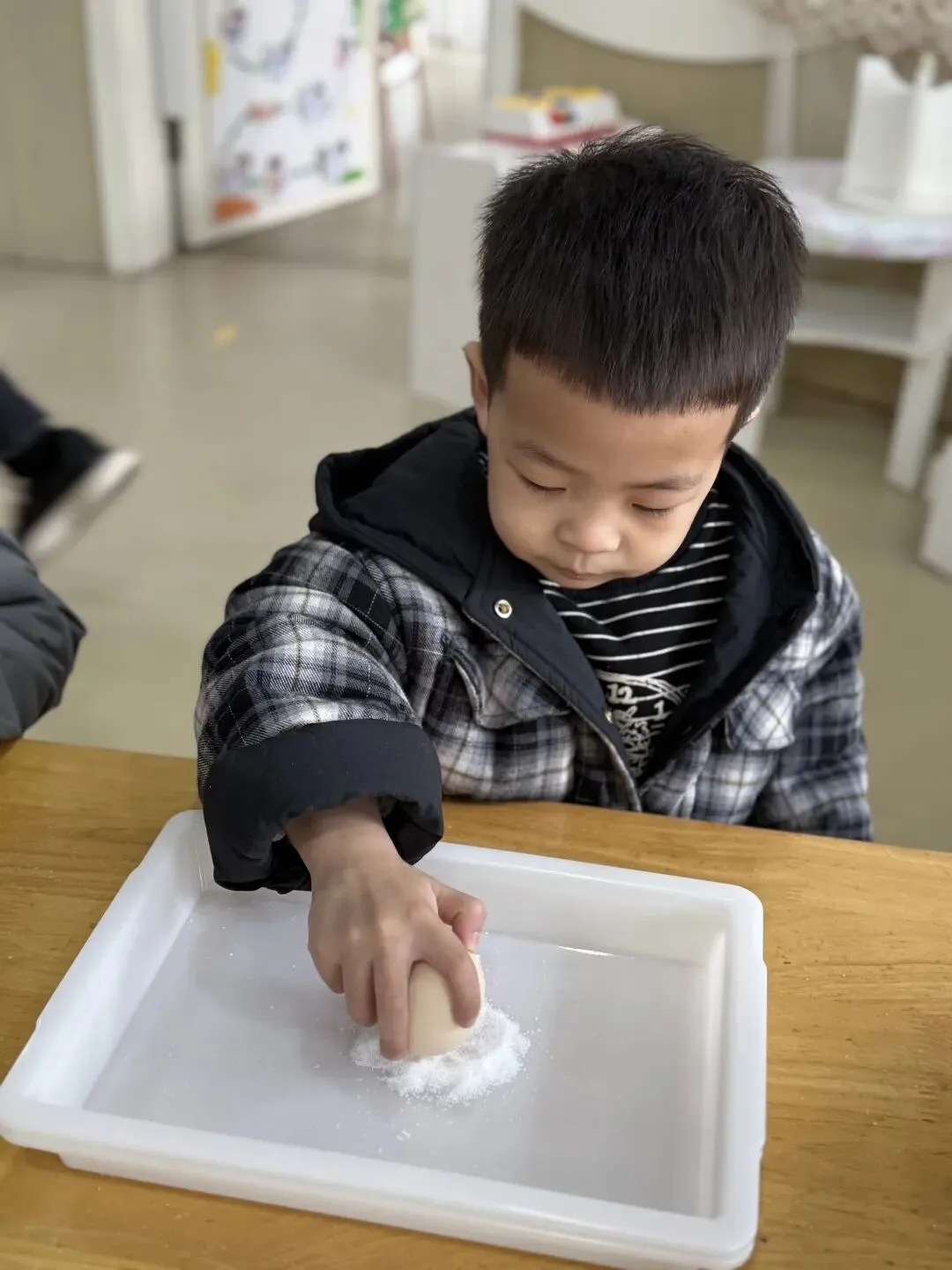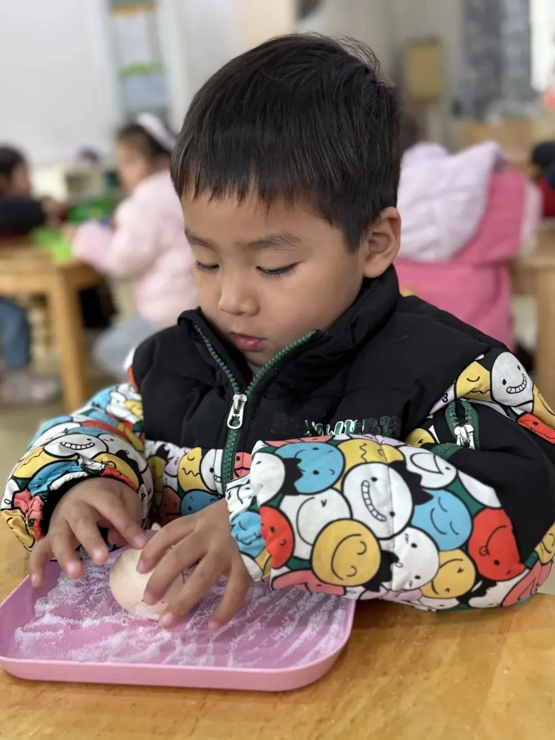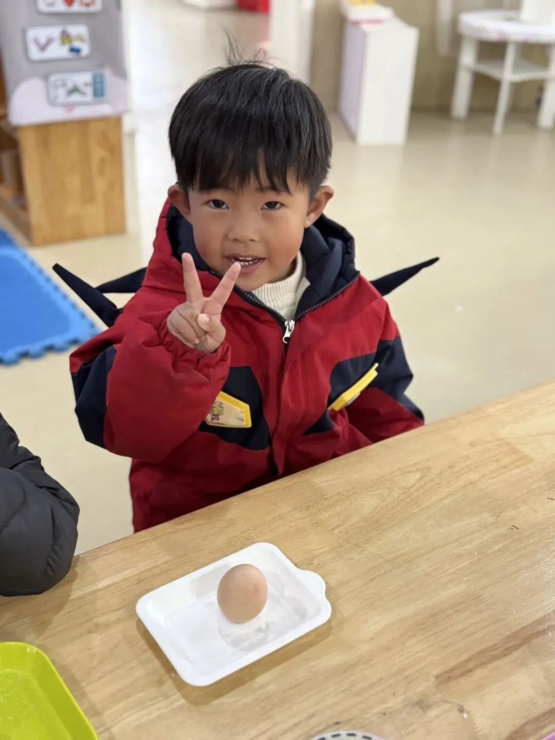 巧立鸡蛋,探索乐趣。涂鸦结束后,孩子们开启了趣味十足的春分立蛋挑战。在老师的引导下,他们尝试借助食盐的支撑力,让圆滚滚的鸡蛋稳稳站立。一次次尝试、一声声欢呼,孩子们在动手实践中感受春分传统习俗的奇妙,收获满满的成就感。