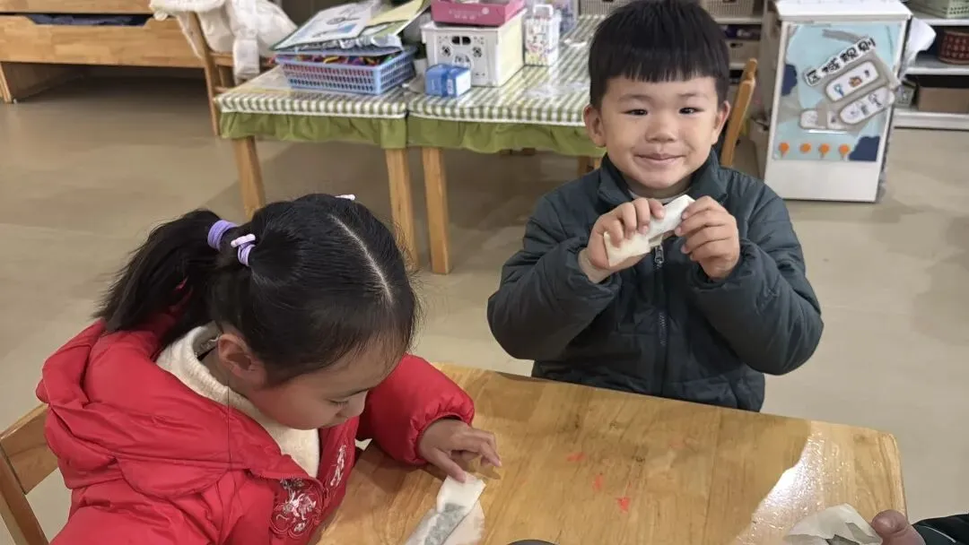 一卷春滋味,一口春日鲜。大二班的孩子们专注地投入春卷制作中,一张张薄饼在他们手中变成美味。孩子们小心翼翼地包裹着馅料,压实、折边,每一个步骤都做得有模有样。
