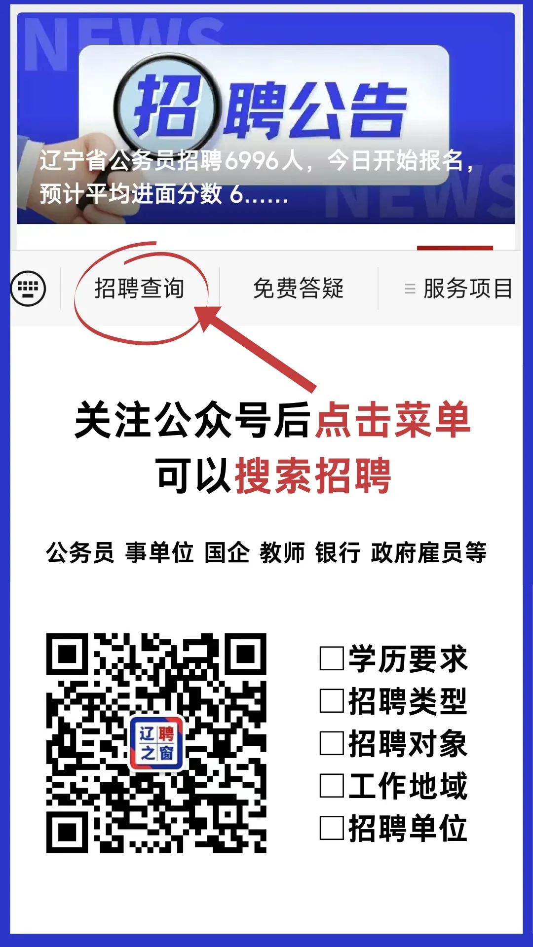 本公众号发布的招聘信息包括:公务员、国企、事业单位、教师、合资企业、外资企业、大型民营企业、政府雇员等