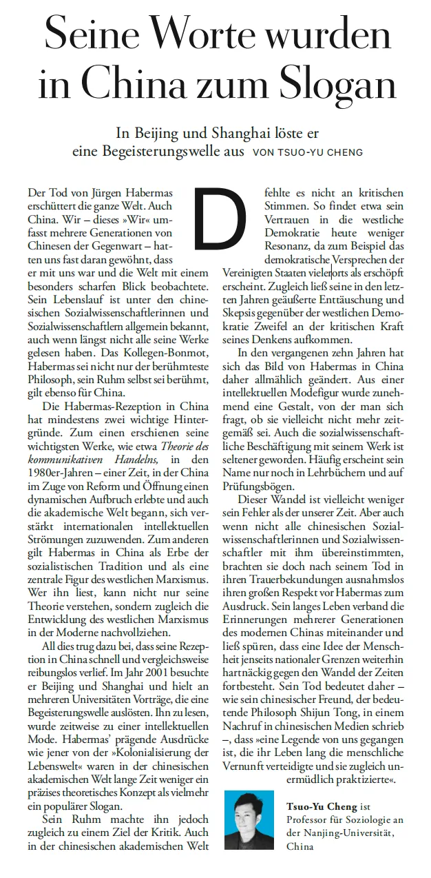近日,南京大学社会学院郑作彧(Tsuo-Yu Cheng)教授,受邀在德国知名媒体《时代周报》(DIE ZEIT)艺文版的哈贝马斯悼念专题中,发表纪念文章,成为参与该专题的重要学者之一。