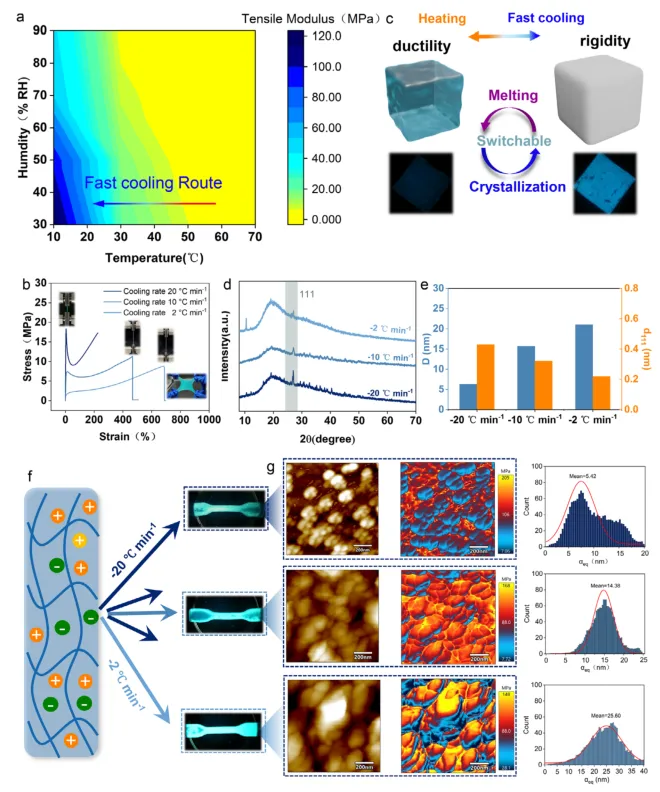 图2 (a)温度与湿度变化对应的杨氏模量变化等高线图。(b)不同热历史冷却并达到最终平衡温度后IG-Ca₅-Co₁材料的拉伸应力-应变曲线。(c)IG-Ca₅-Co₁热历史编程示意图,底部面板为偏光显微镜下获得的IG-Ca₅-Co₁光学显微图像。(d)不同冷却速率过程的X射线衍射图谱。(e)冷却速率为-20°C/min、-10°C/min和-2°C/min时的平均晶粒尺寸(左侧深蓝色纵轴)及d₁₁₁值(右侧橙色纵轴)。(f)不同冷却速率下IG-Ca₅-Co₁的偏光观察图像。注:图像采集过程中孔径、曝光时间和ISO灵敏度保持一致。此外,为增强对比分析的清晰度和一致性,所有三幅图像的亮度和对比度均进行了统一校准。(g)不同冷却速率下IG-Ca₅-Co₁的原子力显微镜图像,包括形貌图、杨氏模量图及平均粒径分布。注:采用等效圆直径近似表示颗粒尺寸。