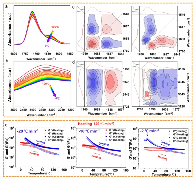 图3 (a、b)IG-Ca₅-Co₁在100°C至0°C温度范围内的变温傅里叶变换红外光谱。(c、d)IG-Ca₅-Co₁在100°C至0°C冷却过程中的二维同步(左)和异步(右)光谱。红色定义为正强度,蓝色定义为负强度。颜色深浅(即红色或蓝色的饱和度)代表两个相应官能团之间相关性的强弱。(e)IG-Ca₅-Co₁的流变曲线显示了加热过程(红线)和冷却过程(蓝线)中损耗模量和储能模量的变化。加热速率从左至右为20°C/min,升温至140°C。冷却速率从右至左分别为2°C/min、10°C/min和20°C/min。