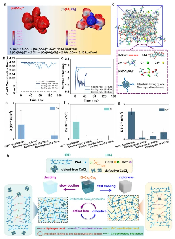 图4 (a)[Ca(AA)₆]²⁺和[Ca(AA)₄Cl₂]相互作用能与分子静电势图的DFT分析。(b)不同冷却速率下Ca-Cl配位数随时间的变化。(c)分子动力学模拟中不同冷却速率下CaCl₂锁定晶体演变的定量分析。(d)IG-Ca₅-Co₁分子动力学模拟的快照与构象轮廓图,以及晶体锁定结构示意图。(e-g)通过不同平衡过程(NPT 20 ns,冷却时间50、100、150 ns)的分子动力学模拟确定的Ca²⁺、Ch⁺和Cl⁻(在聚合物链中)的扩散系数。误差条代表估计值的标准差。(h)IG-Ca₅-Co₁中速率调控结晶增强的示意图。