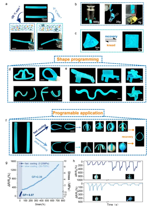 基于这一机械可编程特性,研究团队展示了材料在形状编程和智能机器人领域的创新应用。快速冷却可将IG-Ca₅-Co₁锁定为高刚性状态,能够支撑500 g重物而无明显变形;而缓慢冷却则使其转变为柔软、可塑状态,可被拉伸、扭曲、打结,形成复杂的三维结构(如螺旋、波浪、莫比乌斯环),并通过再次快速冷却实现形状锁定。基于此,团队设计了一种自感知智能机械臂,其操作模式由冷却历史决定:快速冷却使机械臂进入高模量刚性状态,可稳健抓取不规则硬质物体;而缓慢冷却则使其进入超柔软、高延展性状态(拉伸应变达700%),能够轻柔包裹易碎或充气物体。值得注意的是,材料的离子电导率与其力学状态紧密耦合,快速冷却时电导率为1.8 mS·cm⁻¹,而缓慢冷却时增至4.37 mS·cm⁻¹。在高刚性状态下,IG-Ca₅-Co₁作为刚性传感探针,在小应变窗口(0-30%)内实现高达6.07的应力灵敏度;在软态下,则可作为高应变灵敏度传感器,在30-700%的超宽应变范围内保持2.39的应变灵敏度,使机械臂不仅能区分硬质物体,还能感知物体的表面温度和湿度。